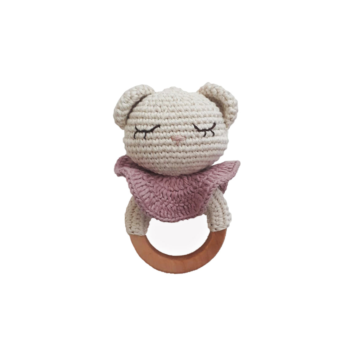 Ce petit ourson a une cloche à l’intérieur qui fait un joli son quand il est secoué. L’anneau en bois est parfait pour soulager les gencives de bébé.