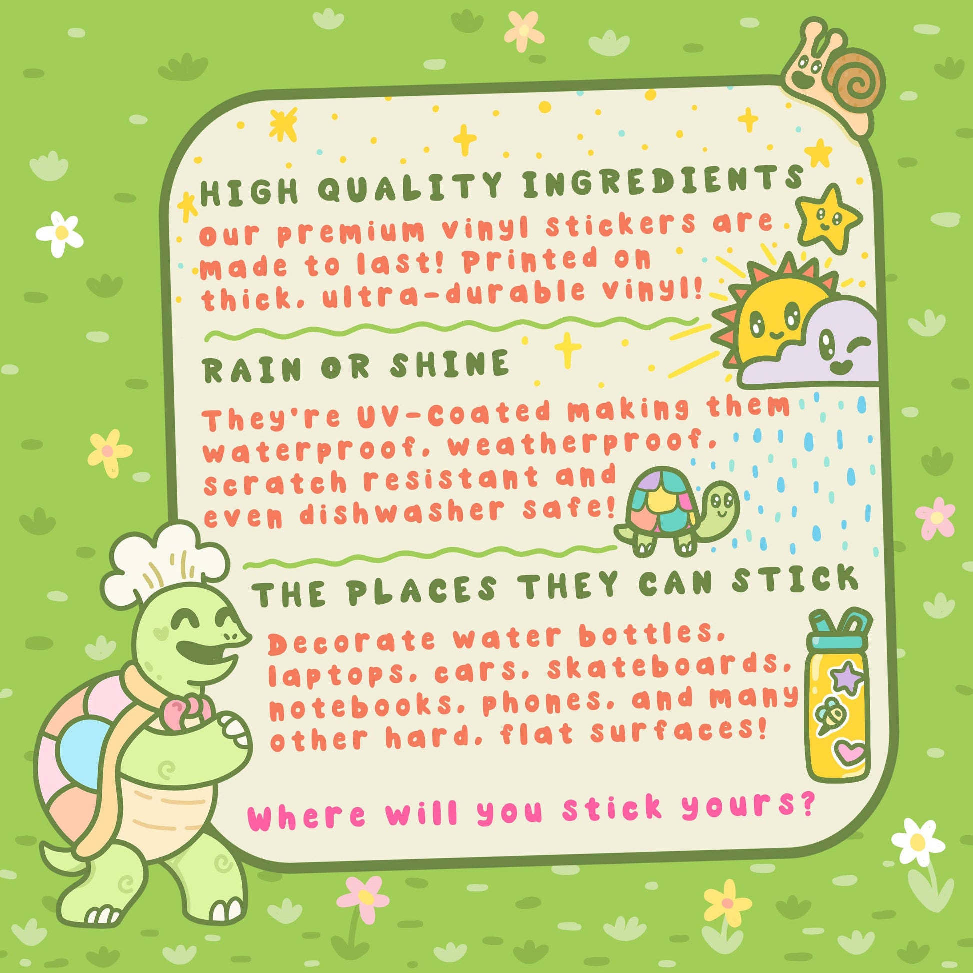 🐢 Nos autocollants en vinyle Turtley Awesome sont fabriqués à partir d'ingrédients de la plus haute qualité sur le marché ! Imprimés sur du vinyle épais et ultra résistant, ces autocollants sont faits pour durer. Ils sont recouverts d'un revêtement UV, ce qui les rend imperméables, résistants aux intempéries et lavables au lave-vaisselle !