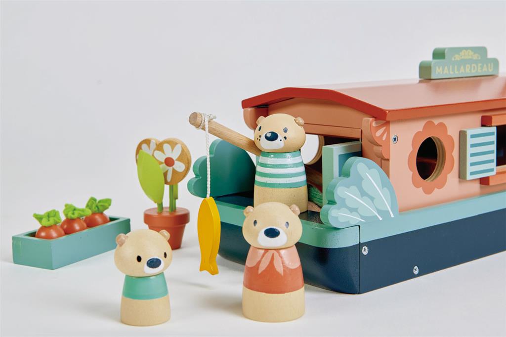 Rencontrez notre nouvelle famille de loutres qui vit sur la rivière dans un magnifique bateau fluvial appelé "Mallardeau", du nom de leur canard colvert préféré, qui trône fièrement à l'avant à l'extrémité avant. Découvrez la petite canne à pêche à l'arrière et la paille rayée qui se double d'une cheminée. Le toit est amovible et la cabine peut être soulevée. L'ensemble comprend : un poêle à bois, un tiroir pour boîte d'allumettes, une table avec couvercle pour pot de confiture avec pieds en forme d'allumette, 3 bouchons de bouteille, 3 sacs de couchage tricotés, une rangée de légumes, une décoration murale de canard colvert, un pot de fleurs, une cafetière et un pot de confiture.