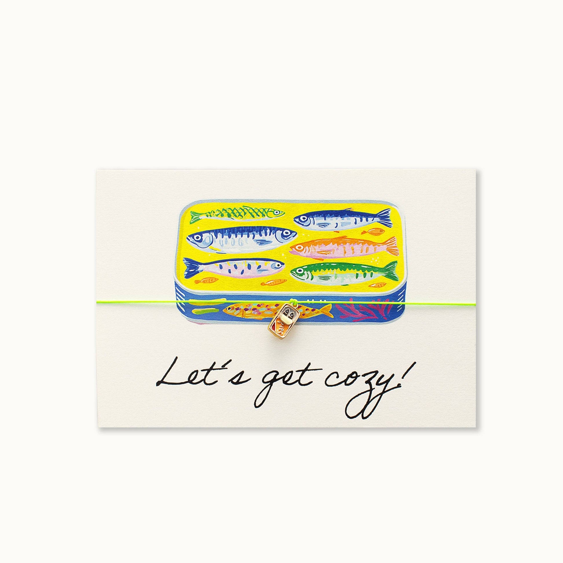 La carte parfaite pour des moments de détente ! Bracelet avec un pendentif en forme de boîte de sardines sur un ruban jaune. Car ce sont les petits détails qui rendent chaque moment de détente encore plus beau ! 🐟