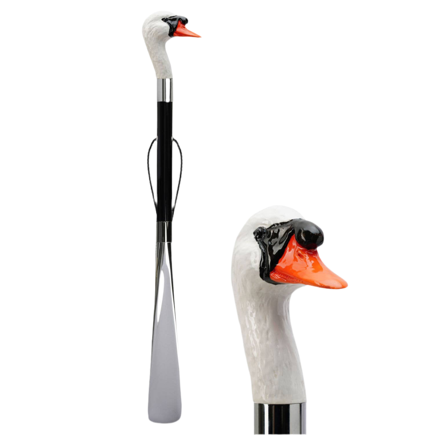Chaussure à longue tige avec un cygne sculpté et peint à la main sur le manche.