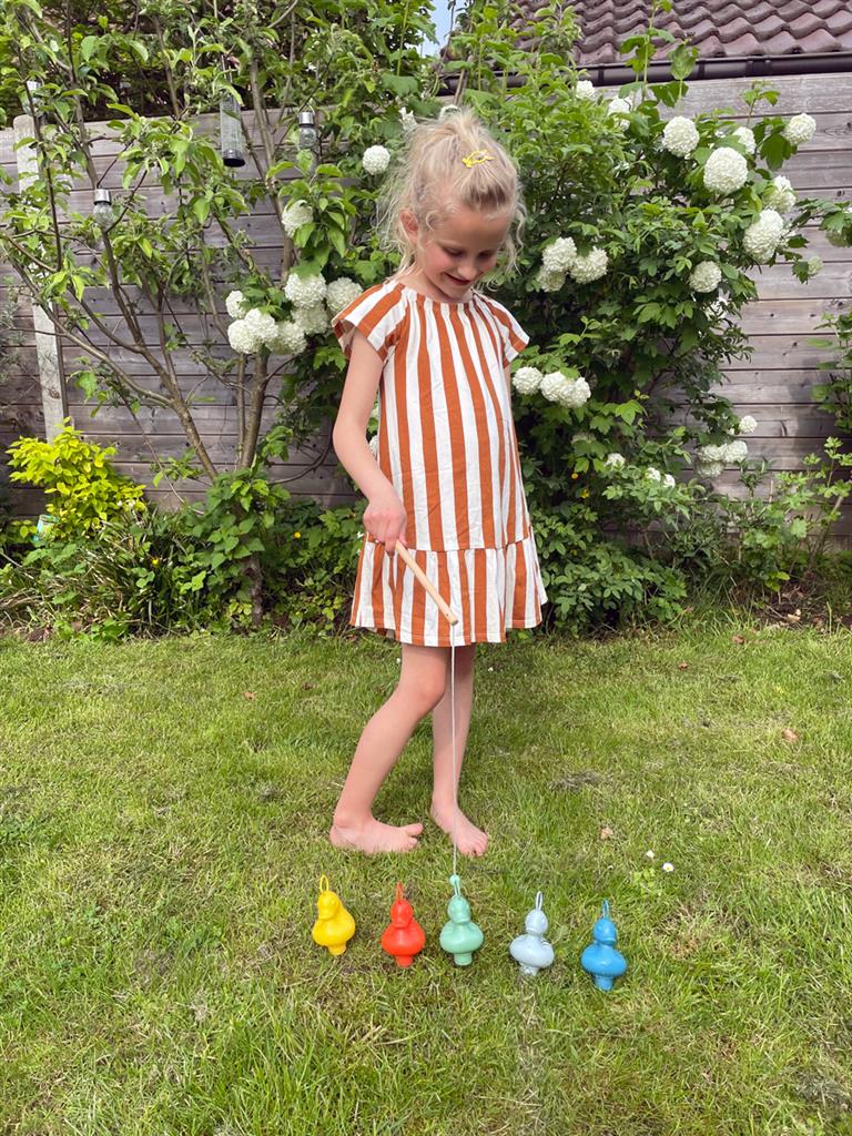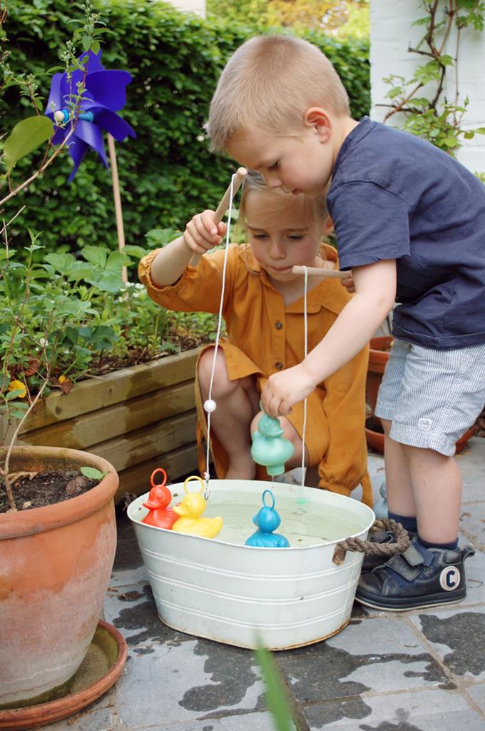 Beaucoup se souviennent du voyage d'enfance à Tivoli et de la visite obligatoire à l'étang aux canards où les canards naviguaient en rond. Un endroit où la victoire était garantie lorsqu'un canard mordait à l'hameçon. Que le prix soit dans la baignoire ou dans le bassin d'eau de la maison dépend de chacun, mais la magie reste la même avec le jeu de pêche au canard de Scratch, comme c'était le cas à Tivoli. L'ensemble comprend six canards joyeux, tous flottant joliment dans l'eau grâce au contrepoids en bas. Tous les canards ont une boucle sur la tête, ce qui les rend faciles à attraper avec les cannes à pêche incluses.