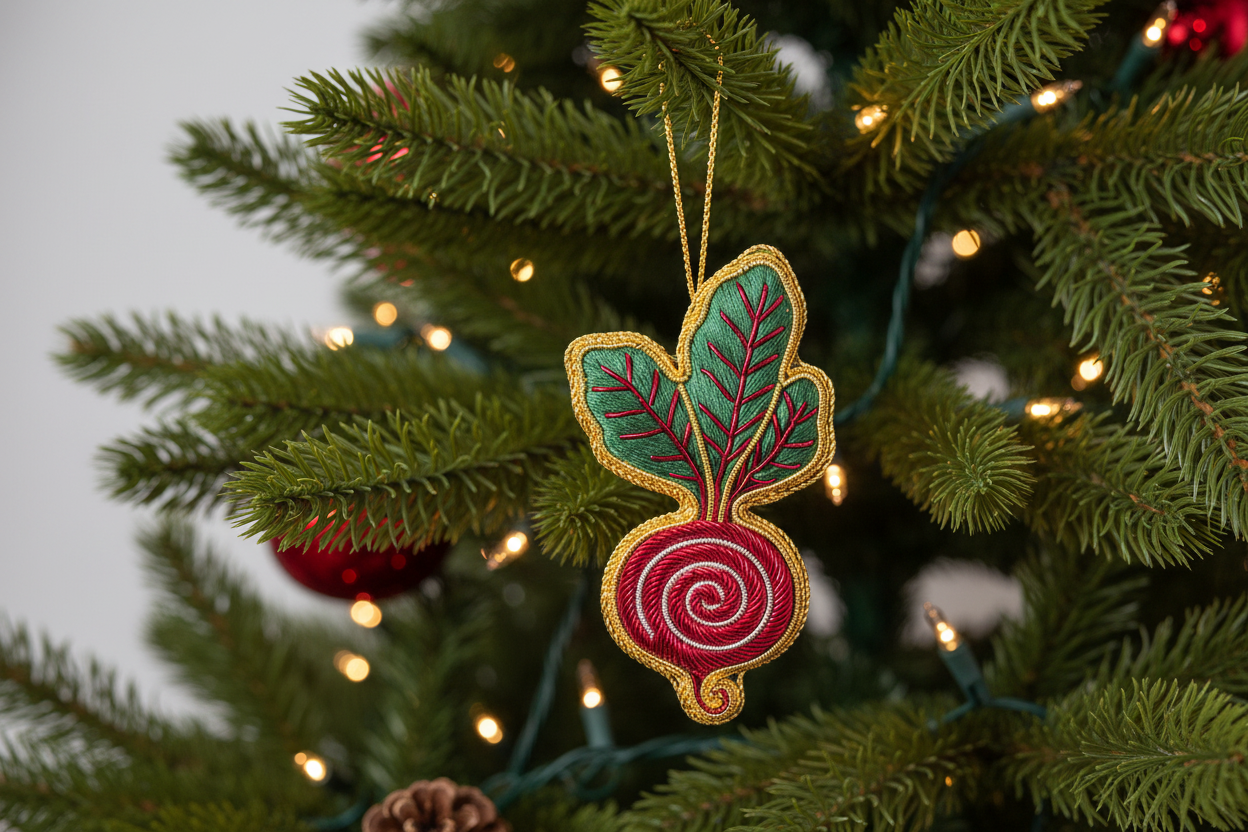 Veuillez garder les commandes de décorations de Noël séparées des lignes de cadeaux générales. Les commandes contenant des décorations de Noël et des lignes de cadeaux seront divisées et nous expédierons les lignes générales séparément. Fabriquée à la main avec la technique de broderie zari pour créer notre design de légumes de Noël, cette décoration perlée est dans une belle palette de couleurs de violet, vert et or.
