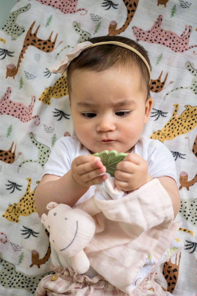 Doudou hippo en mousseline vert sauge avec anneau de dentition en caoutchouc naturel.
