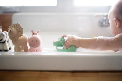 Jouets de bain en caoutchouc naturel et anneaux de dentition.