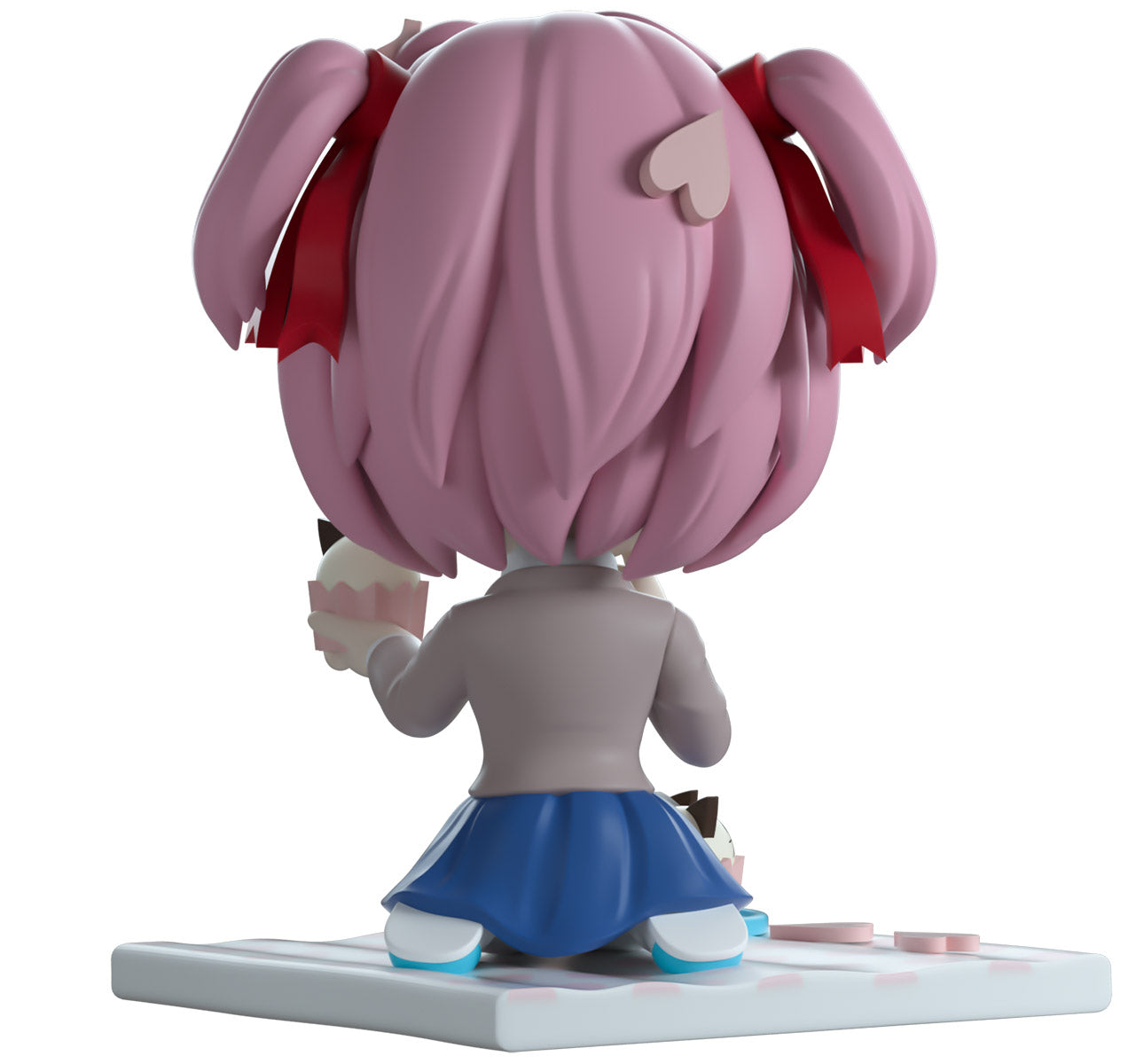 Natsuki revient sur Youtooz pour sa deuxième figurine en vinyle et pour un pique-nique agréable avec ses meilleures amies ! Tenant un Kitty Cupcake dans ses mains et léchant le glaçage d'un doigt levé, elle repose sur ses genoux à 3,8 pouces de hauteur avec un plateau de délicieux cupcakes posé devant elle. Avec des cheveux roses courts attachés avec des rubans rouges, son visage rougit de joie alors qu'elle porte son uniforme scolaire qui consiste en un blazer marron clair sur une jupe plissée bleue avec une cravate rouge à son col. Chacune des filles est assise sur une section de couverture à pois rose et blanc, prête à être exposée à côté des 3 autres et à faire le pique-nique parfait ! L'extérieur de son emballage montre une couverture de pique-nique posée dans un champ tranquille tandis que des fleurs rose vif s'écoulent avec la brise et qu'une montagne pittoresque se trouve en arrière-plan. L'intérieur est vert pâle avec des motifs floraux roses, tandis que la pochette de protection est à pois avec de délicieuses friandises posées sur le côté tandis que sa figurine peut être vue à travers la grande fenêtre transparente à l'avant. Cet objet de collection est livré dans une pochette extérieure protectrice mate et gaufrée et un protecteur en plastique de taille personnalisée pour une protection maximale pendant l'expédition.