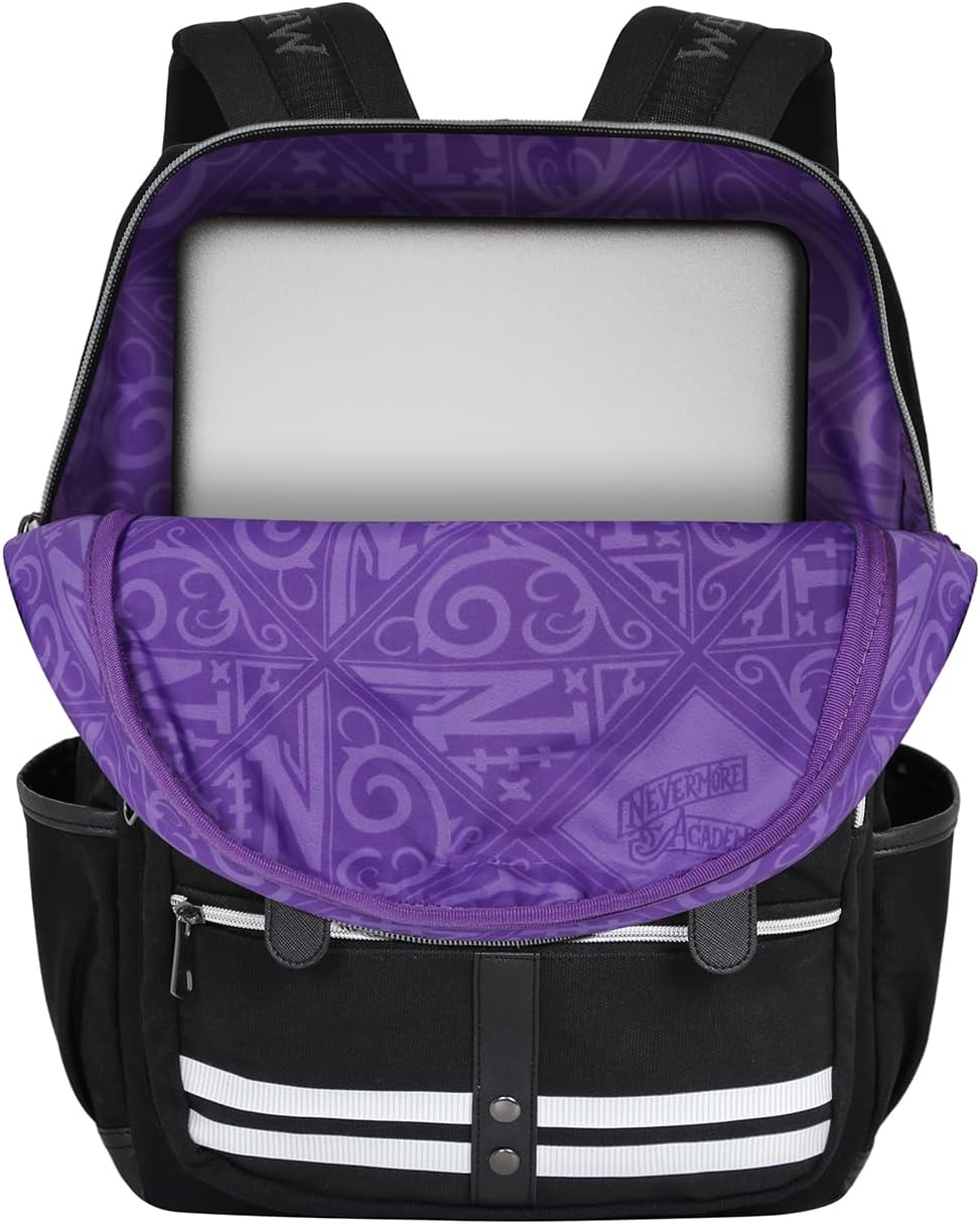 Karactermania présente sa gamme de sac à dos haute qualité à l’effigie de la série Netflix à succès Wednesday. Retrouvez l’univers de Mercredi Addams à travers ce superbe sac à dos d’inspiration rétro comprenant deux compartiments zippés recouverts d’un rabat à lanières, une doublure intérieure avec poche rembourée pour appareils électroniques ainsi que deux poches latérales. Il est également composé d’une sangle arrière pour valise et de bretelles rembourrées ajustables.