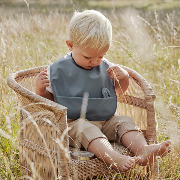 Their wide cut covers both the shoulders and the chest, the flexible pocket at the front grabs all the falling food and the crumbs, which means less dirt on the ground. The bib is attached to the neck using a large and soft velcro and perfectly adjusts to children.