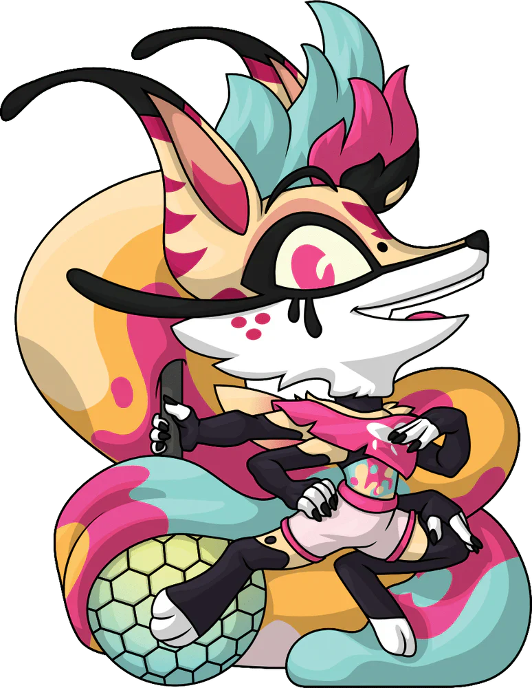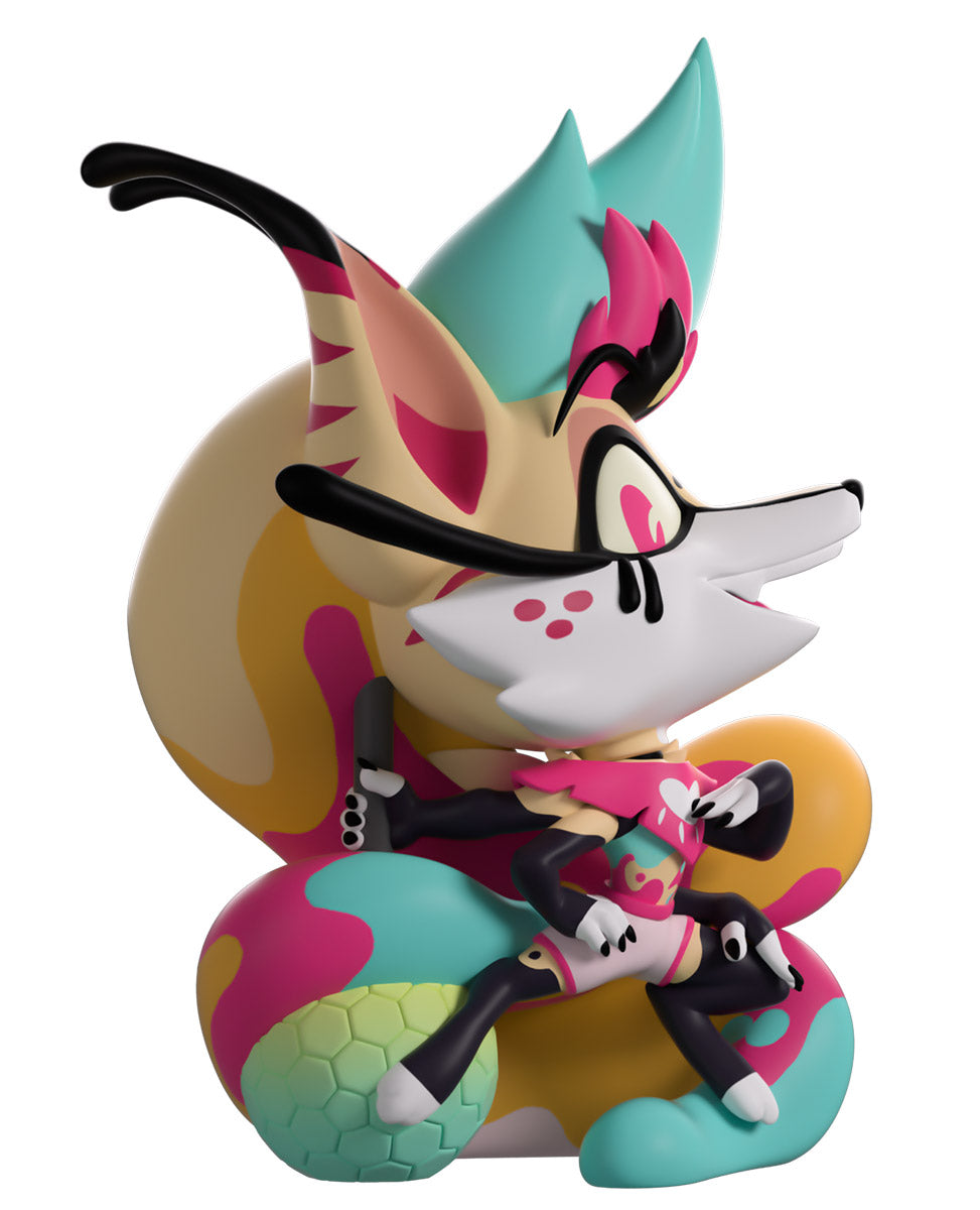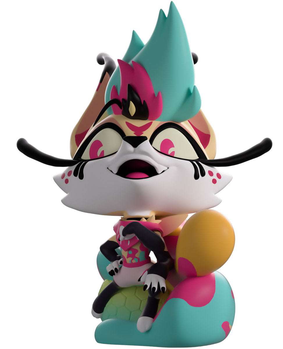 Beelzebub has arrived at Youtooz to throw the most spectacular party in the world, and you're invited! Strutting in at 4.6 inches tall with a big smile stretching across his white fox face with bright ink spots on his cheeks and long eyelashes that extend to the sides, turquoise and pink eyelashes peek out from between two curled ears and down his back in colorful spots that wrap around a honeycomb patterned ball. Always the absolute life of the party, Beelzebub wears a colorful top that matches his tail and has a pointed collar with a heart on the chest with pink short shorts. The outside of his packaging sees his light and curvy silhouette set against a dark orange background, while the inside features a huge honeycomb disco ball that glows against the bright walls. The protective sleeve is then decorated with diagonal yellow stripes and printed with the "Helluva Boss" logo as their silhouette can be seen through the large clear display window on the front. This collectible comes in a protective, embossed, matte outer sleeve and a custom-sized plastic protector for maximum protection during shipping.