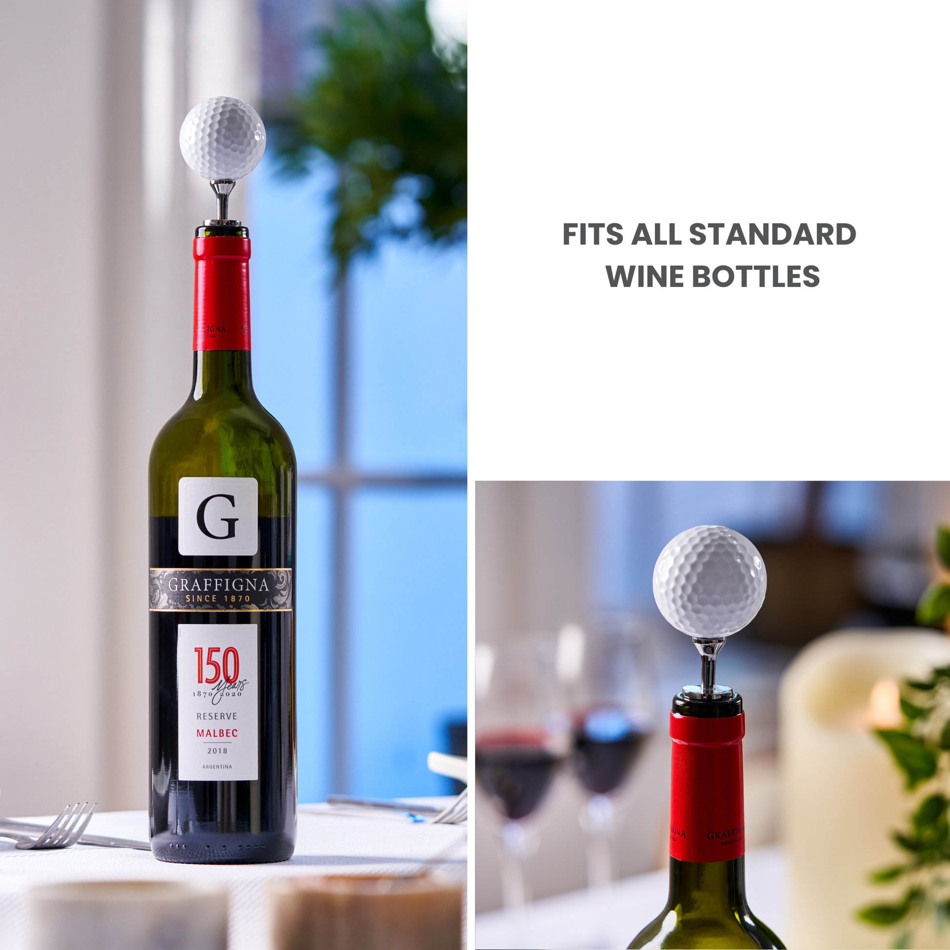 Golf-themed wine bottle stopper with a real golf ball on top of a tee-shaped stopper.