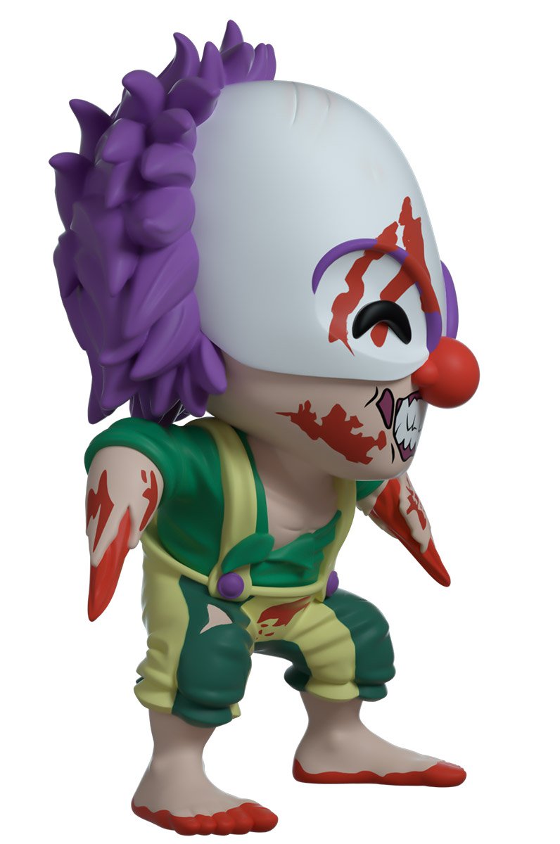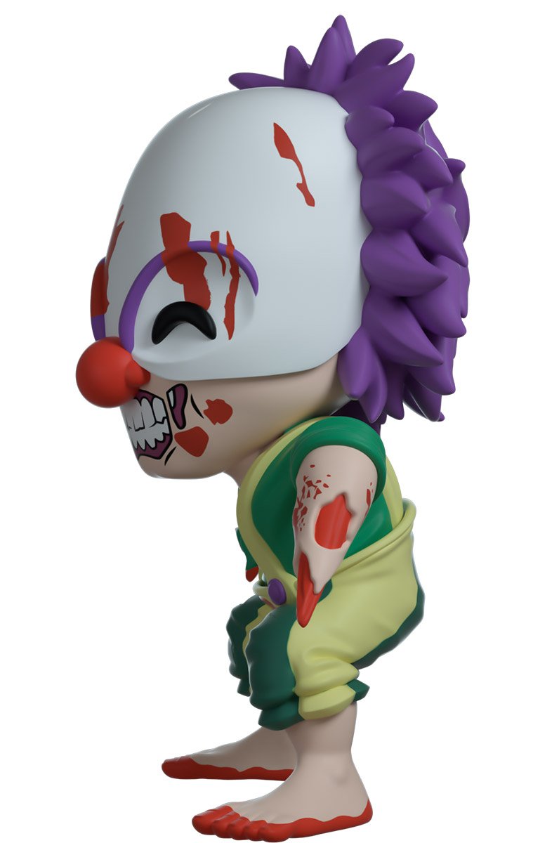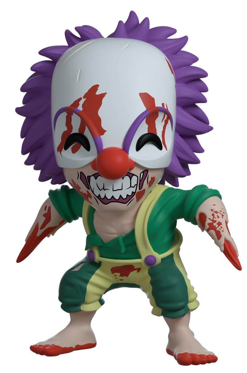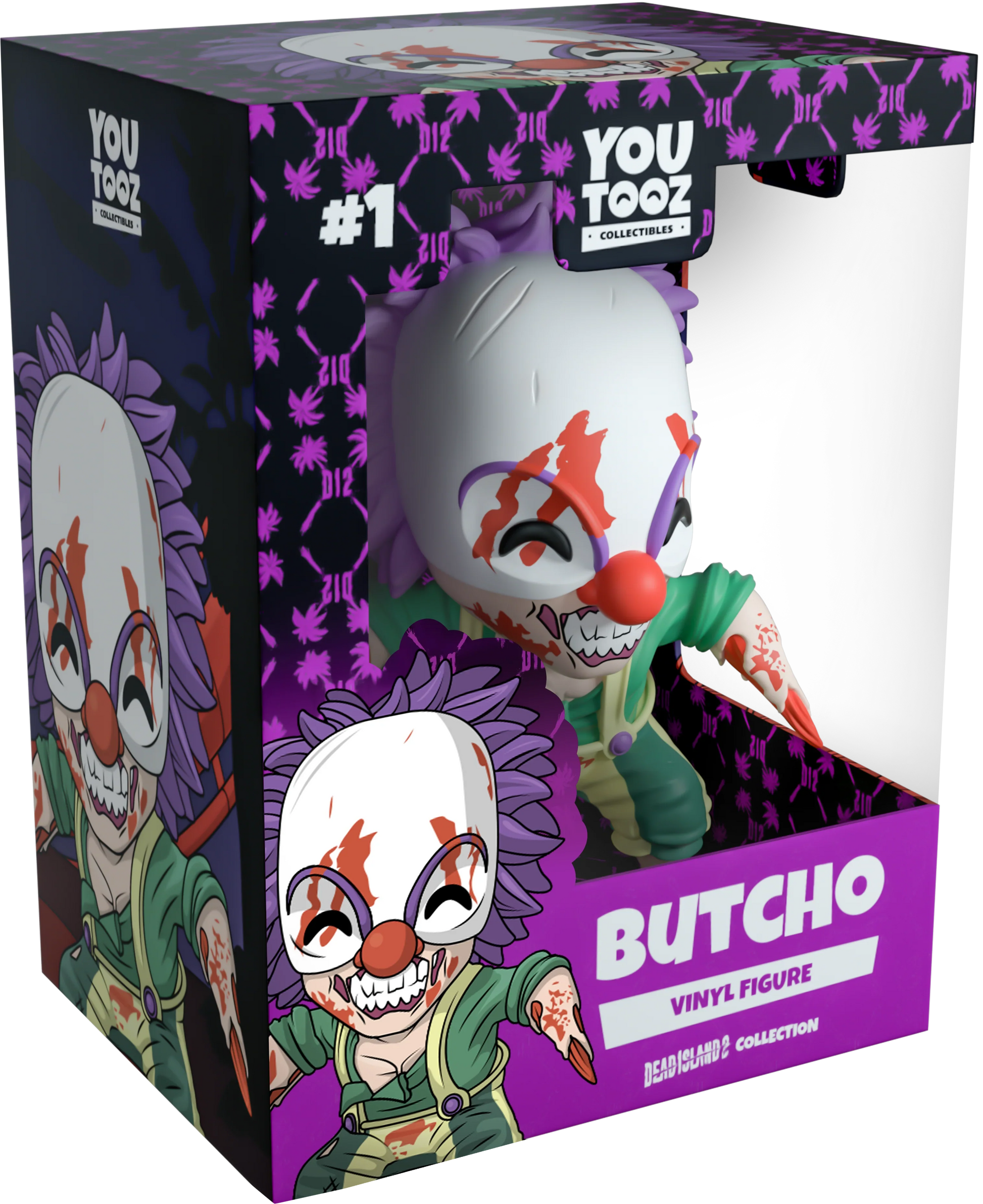 Think I can help? Butcho the Clown is slicing and slaughtering a miniature figure! Butcho stands 4.3 inches tall and is dressed in a disheveled yellow and green clown outfit. His feet are bare, with a layer of blood on the bottom. His face is partially covered by a white clown mask with purple hair sticking out from the back of his head. His fleshy, toothy grin glints beneath his large red nose. Butcho stands ready with his flesh-pointed arms spread wide. The glass-fronted display box has been illustrated to show an amusement park at dusk with pools of blood on the ground. The inside of the box features the Dead Island 2 logo on a gradient background. The protective sleeve shows a sunset from above the Hollywood sign, with the ocean stretching into the distance. This collectible comes in a protective, embossed, matte outer sleeve and a custom-sized plastic protector for maximum protection during shipping.