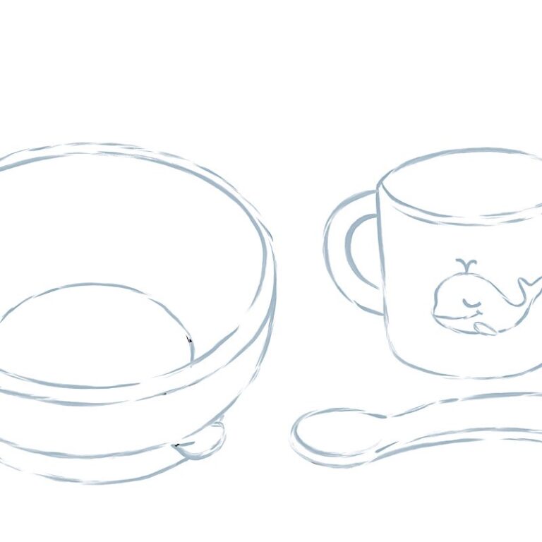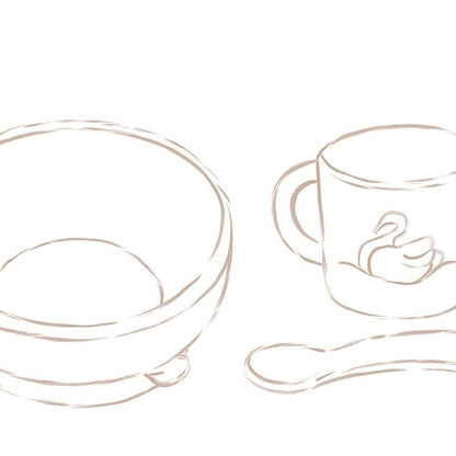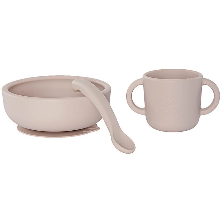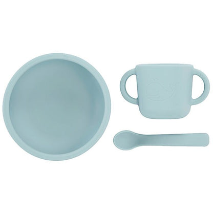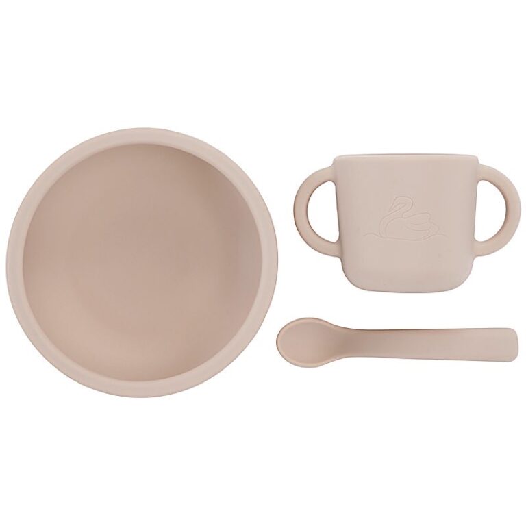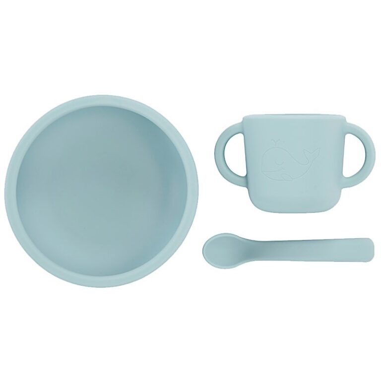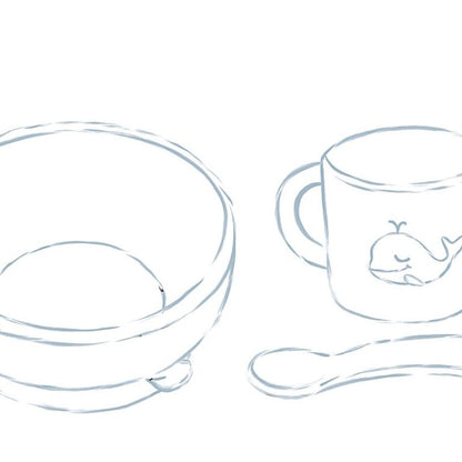 A box with spoon, bowl and cup. Pink version is swan and blue with a whale. 100% Food Safe silicone.