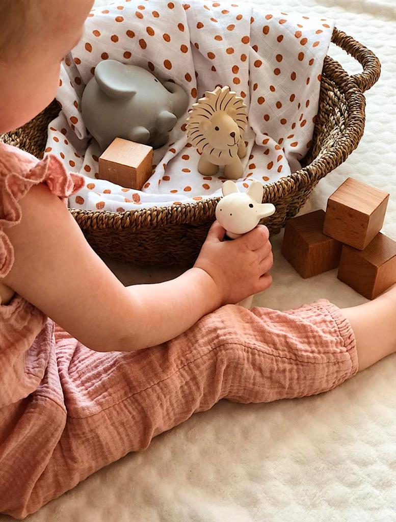 Natural rubber bath toys and teething rings.