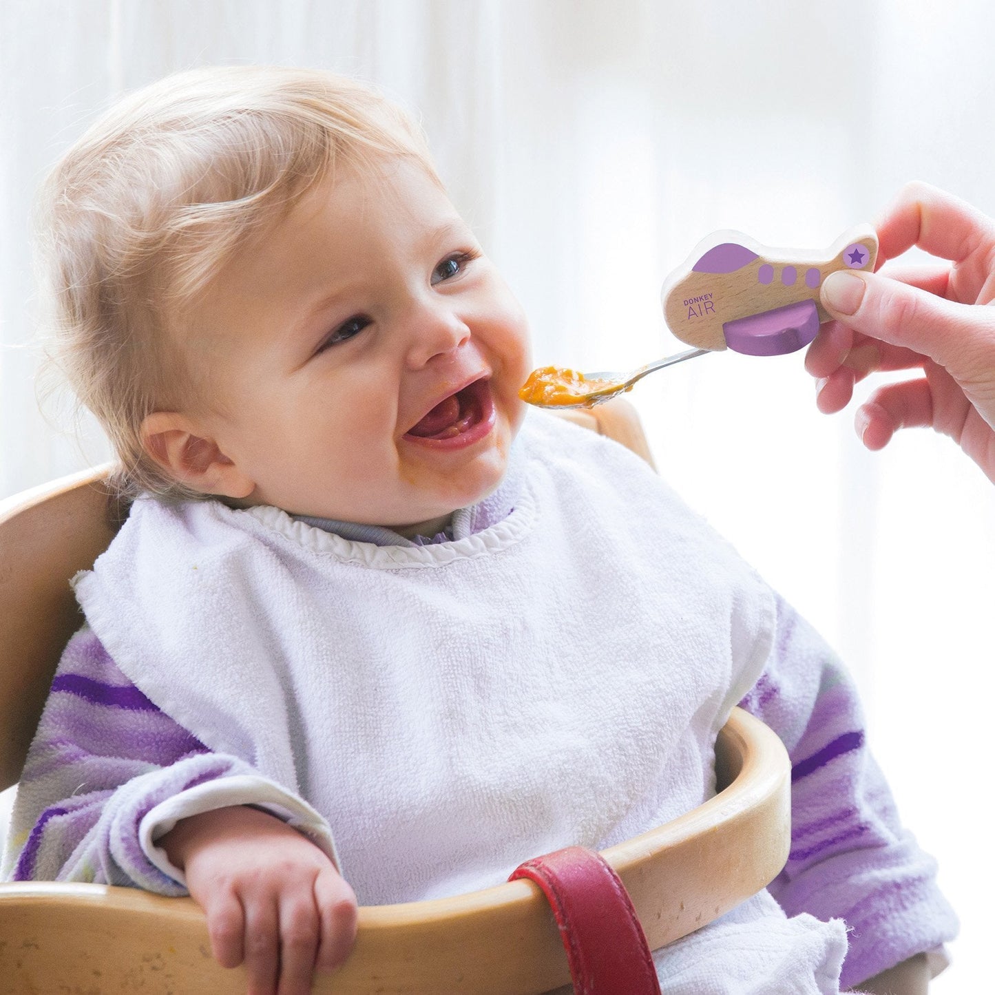 "Ladies and gentlemen, we are about to land. Please place the child seat upright and keep your mouth wide open." Done! Despite the turbulence, the peas have landed safely in your stomach with great fun and thanks to Knatter, the wooden airplane with a securely attached spoon. Feeding and eating becomes an experience.