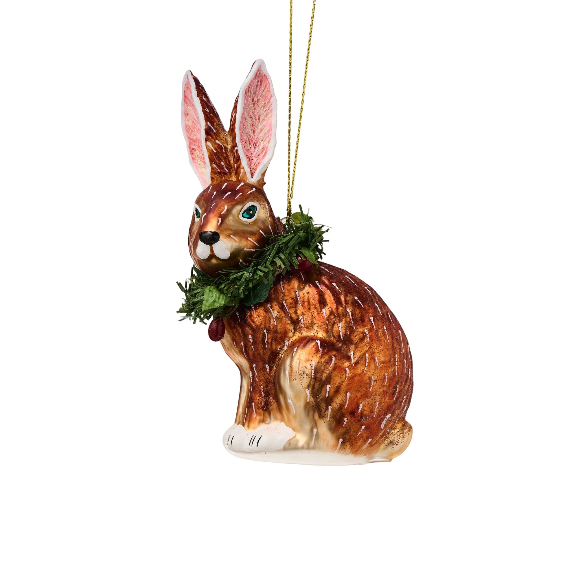 Bring a touch of nature and softness to your tree with this hand-blown glass bunny , adorned with a charming wreath of greenery and small red berries.