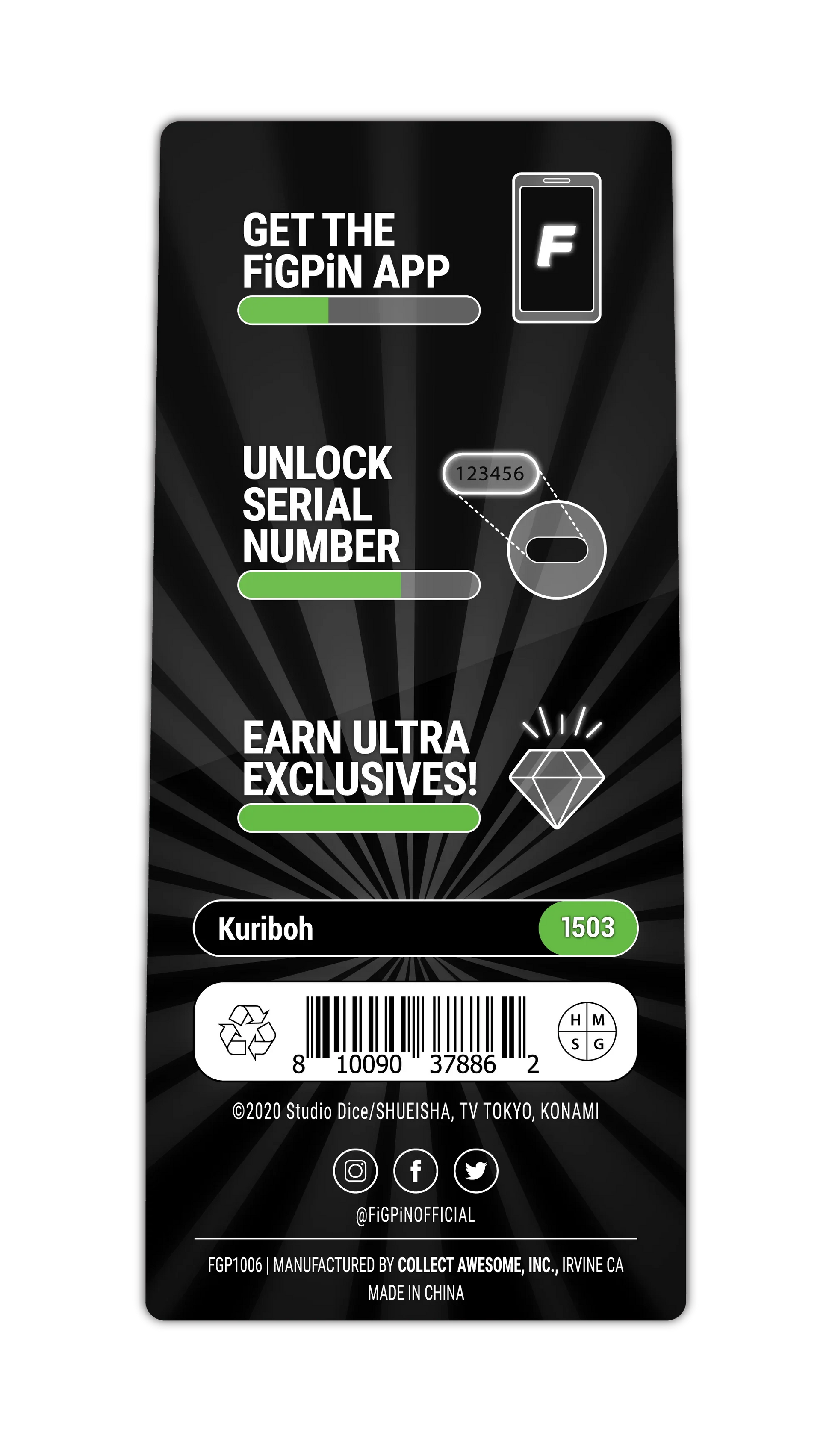 Collect Awesome. Share and display your FiGPiNS anywhere, anytime with our innovative pin holders and museum-quality display cases. FiGPiNS can be displayed as your most coveted silhouette or worn as your favorite accessory. Pin them to your favorite bag or jacket, or simply display them on your desk. No matter where you place them, you’ll be sure to stand out! Each FiGPiN is made from die-cast zinc alloy inlaid with hard enamel and finished with an electroplated nickel coating. All FiGPiNS include a unique alphanumeric serial number engraved on the back, making each one one-of-a-kind. With the FiGPiN app, you can unlock the serial number to discover the rarity of your FiGPiN and start earning points as the proud owner of a great FiGPiN. Available now for Android and iOS devices!