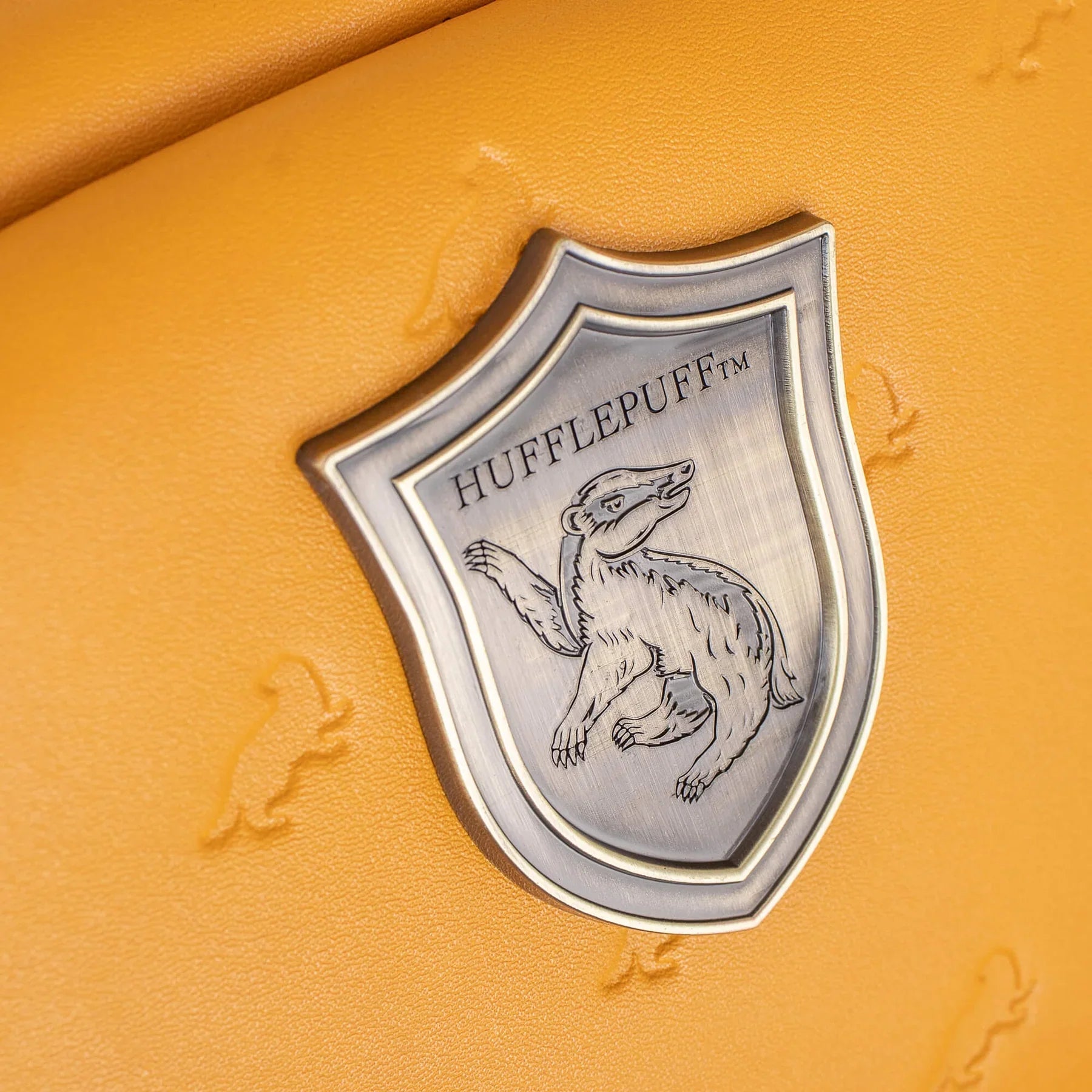 Proudly displays the Hufflepuff crest, with luxurious all-over embossed detailing and a pom-pom zip fastening.