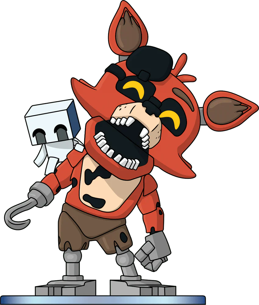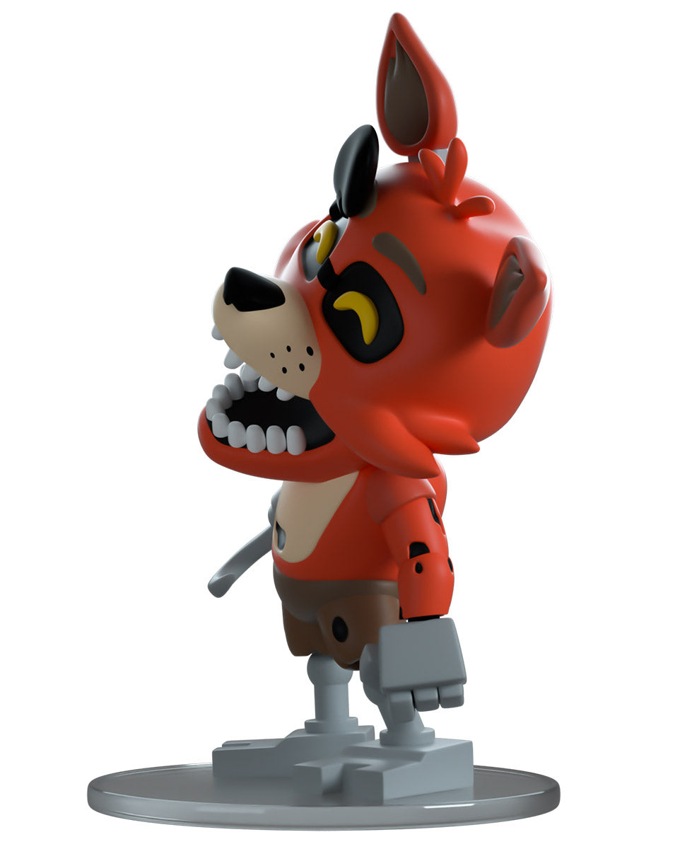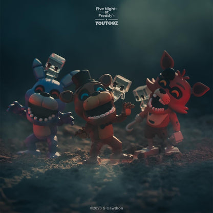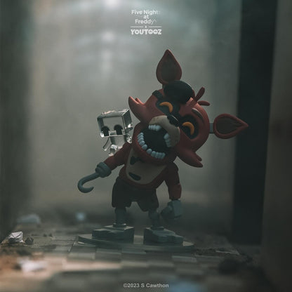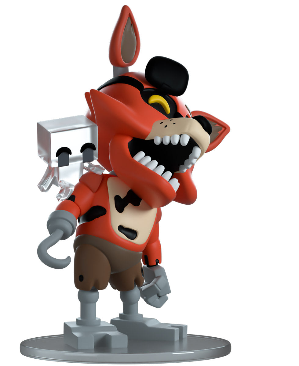 Standing 4.9 inches tall and tilted to the side with an open fanged snout, his eye patch has flipped up to reveal a pair of glowing yellow pupils emanating from deep, dark eye sockets while long, pointed ears and tufts of fur protrude from a lifeless face. With a small, light ghost sitting on his shoulder and a gray hand clutching his right hand, the left is a clenched metal fist as his bare endoskeleton legs protrude through a pair of tattered brown shorts. The outside of his packaging shows a ghost escaping from Foxy's open mouth, while the inside shows the same ghost flying through the air vent of the security room. The protective sleeve is a close-up of the pizza parlor wall and shows Foxy's silhouette through the large clear window on the front. This collectible comes in an embossed matte protective outer sleeve and a custom-sized plastic protector for maximum protection during shipping. Youtooz consulted with FNAF Fanverse game creator Kane Carter for the development of the Haunted collection.