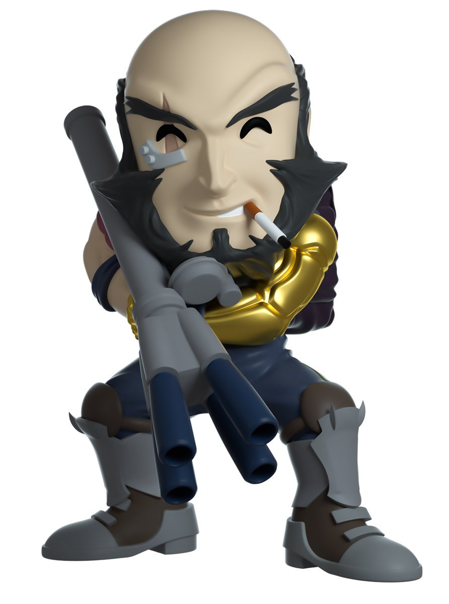 I am the black dog, and when I bite, I don't let go. Jet Black is the captain of the Bebop and leader of his crew. He is known as the Black Dog! Standing 5 inches tall, Jet Black holds a flamethrower in both hands. His robotic arm is sculpted to show the grooves and individual pieces. A cigarette peeks out of his mouth, which completes his cheeky grin. He wears gray and brown boots. His face includes the scar over his eye and the metal plate that holds his wounds together. His double-walled window box is illustrated to show the inside of the Bebop when the power was cut. This collectible comes in a protective, embossed matte outer sleeve inspired by the opening sequence of Cowboy Bebop.