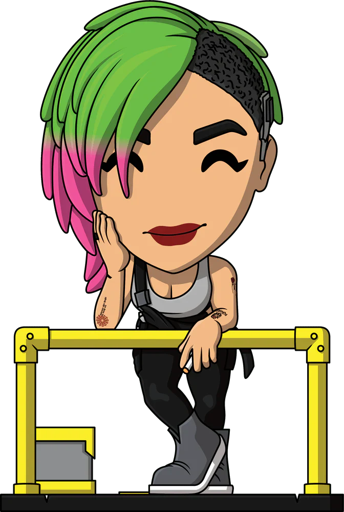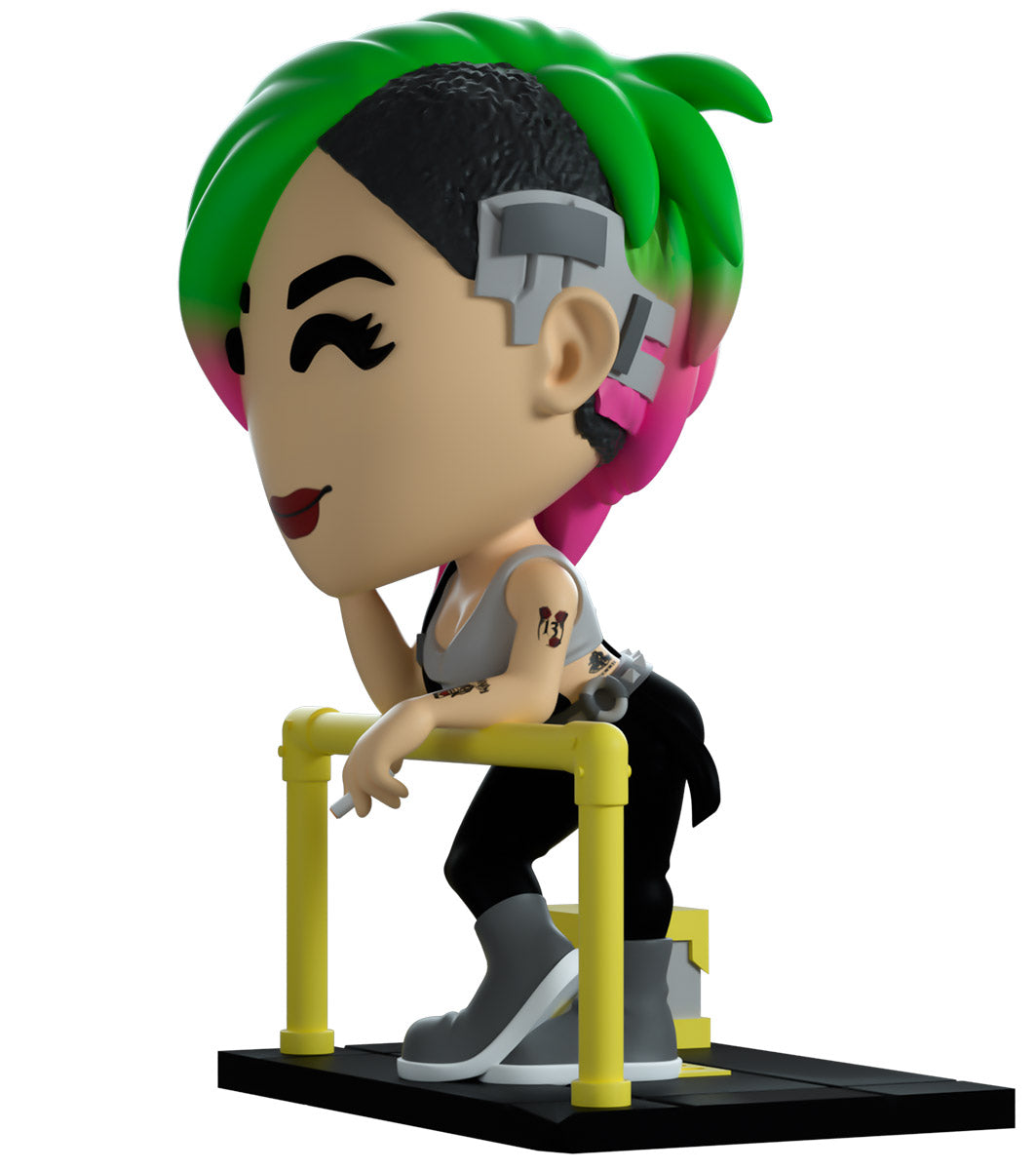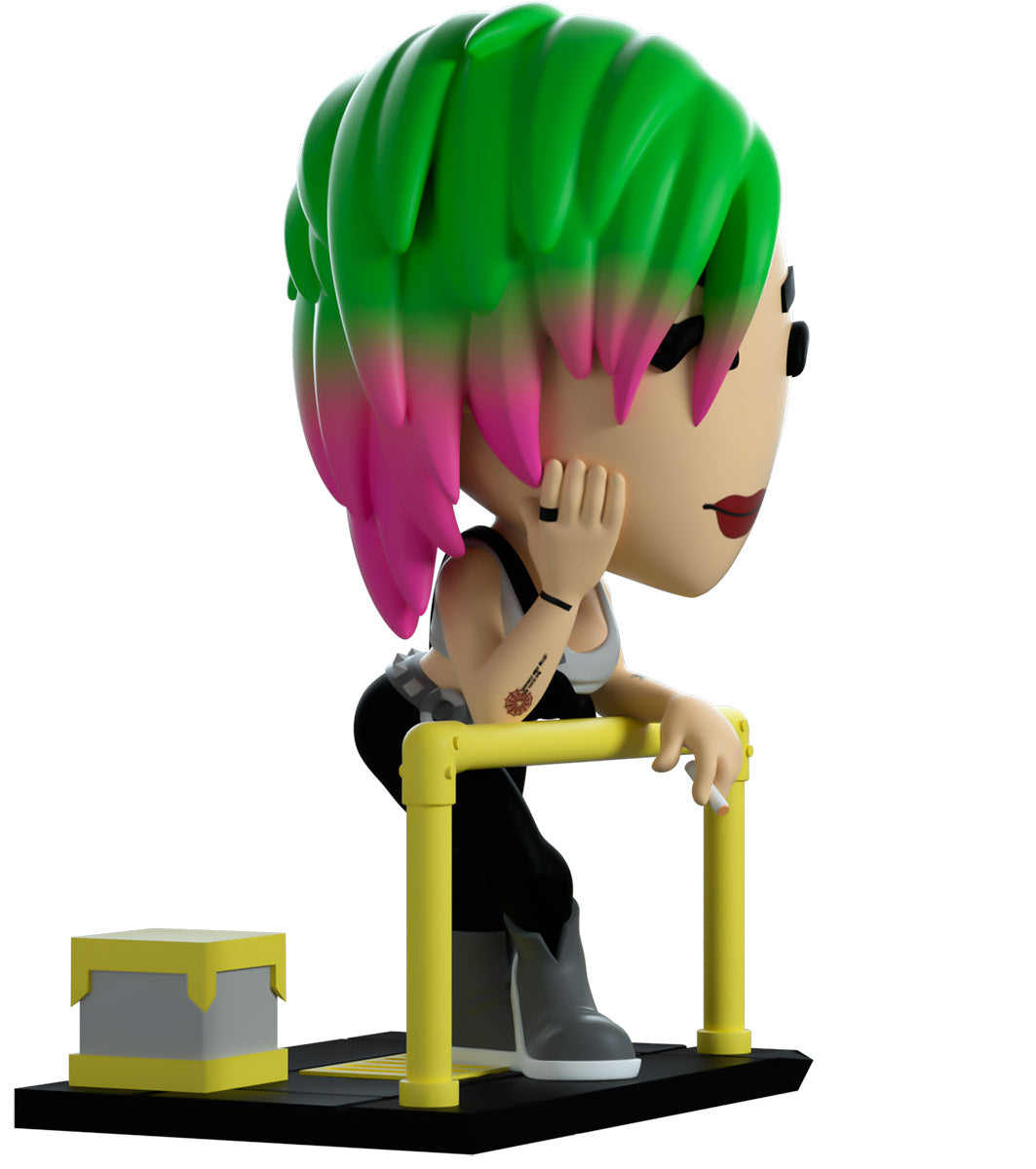 Wait, rewind that! Now change the frequency... No doubt about it, this is Judy's first Youtooz! Taking a break from a hard day of brain-dancing scans to relax as best she can, a lit cigarette dangles from her fingers as she leans forward on a bright yellow railing to look out. With gray cybernetic clothing resting on the shaved side of her undercut, shoulder-length green hair with pink tips sweeps to the side to rest near the hand supporting her head. With dark red lipstick and wearing a simple gray tank top that highlights her tattoos, her black overalls are held up by a strap over her shoulder as she presses the toe of a gray sneaker to the ground. The outside of her packaging shows Judy leaning on a yellow railing looking out over a dark nighttime city. While the interior is a bright yellow and features a silhouette of the night city with the “Cyberpunk 2077” logo, this then continues onto the protective sleeve where its silhouette can be seen through the large clear display window on the front. This collectible comes in a protective matte, embossed outer sleeve and a custom-sized plastic protector for maximum protection during shipping.