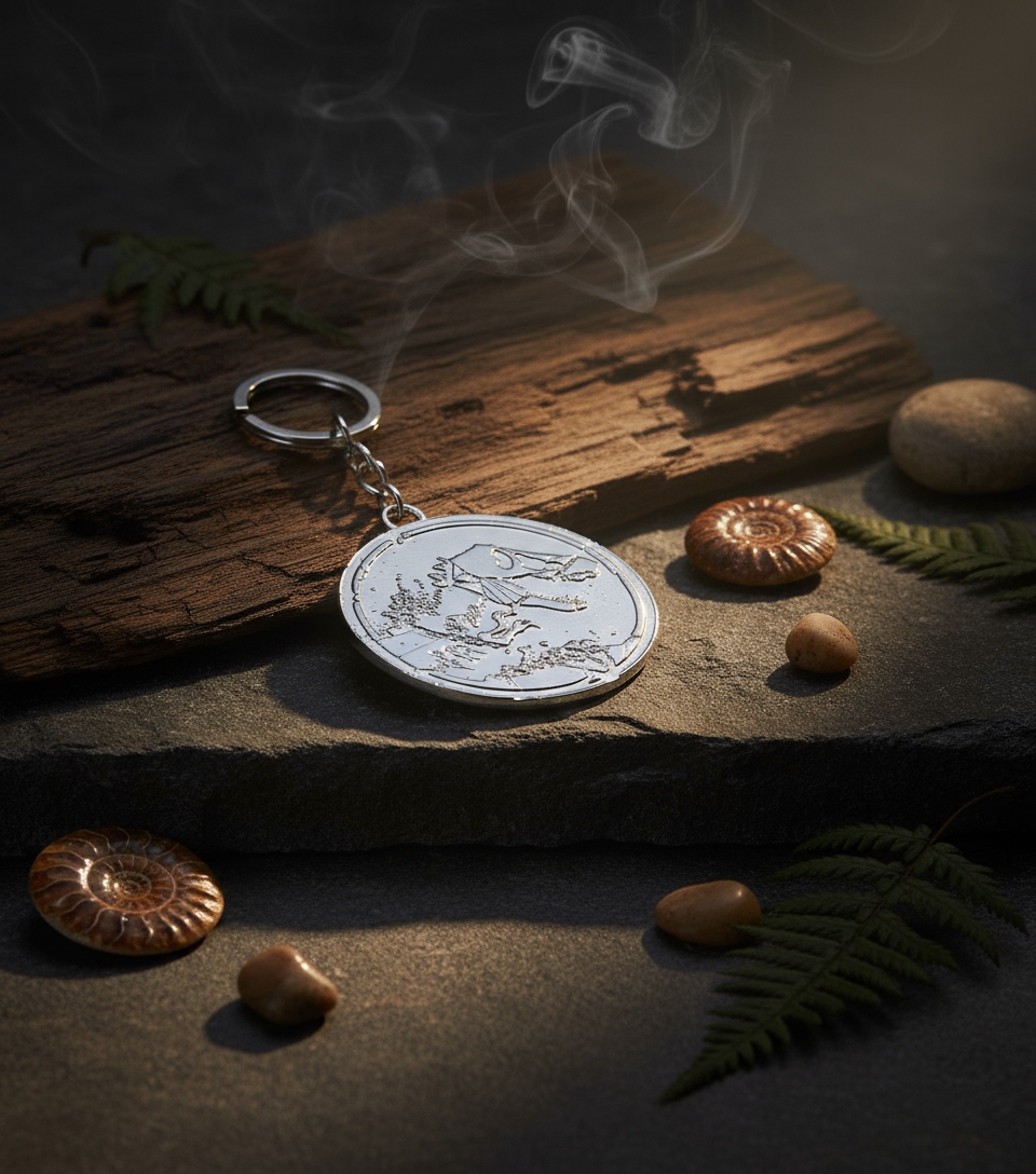 Jurassic World metal keychain with embossed symbol on backing card, 7.5 x 0.5 x 17.5 cm