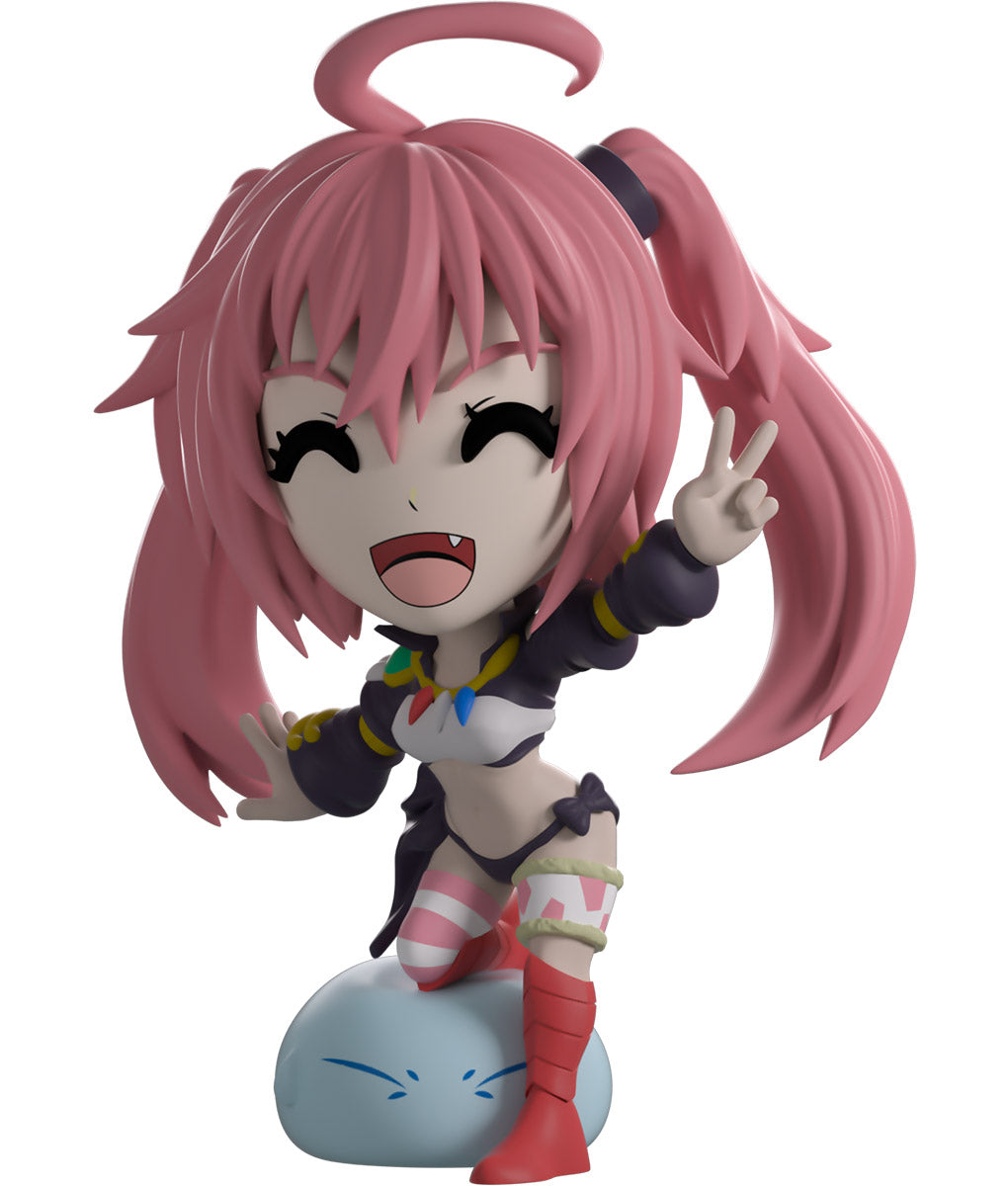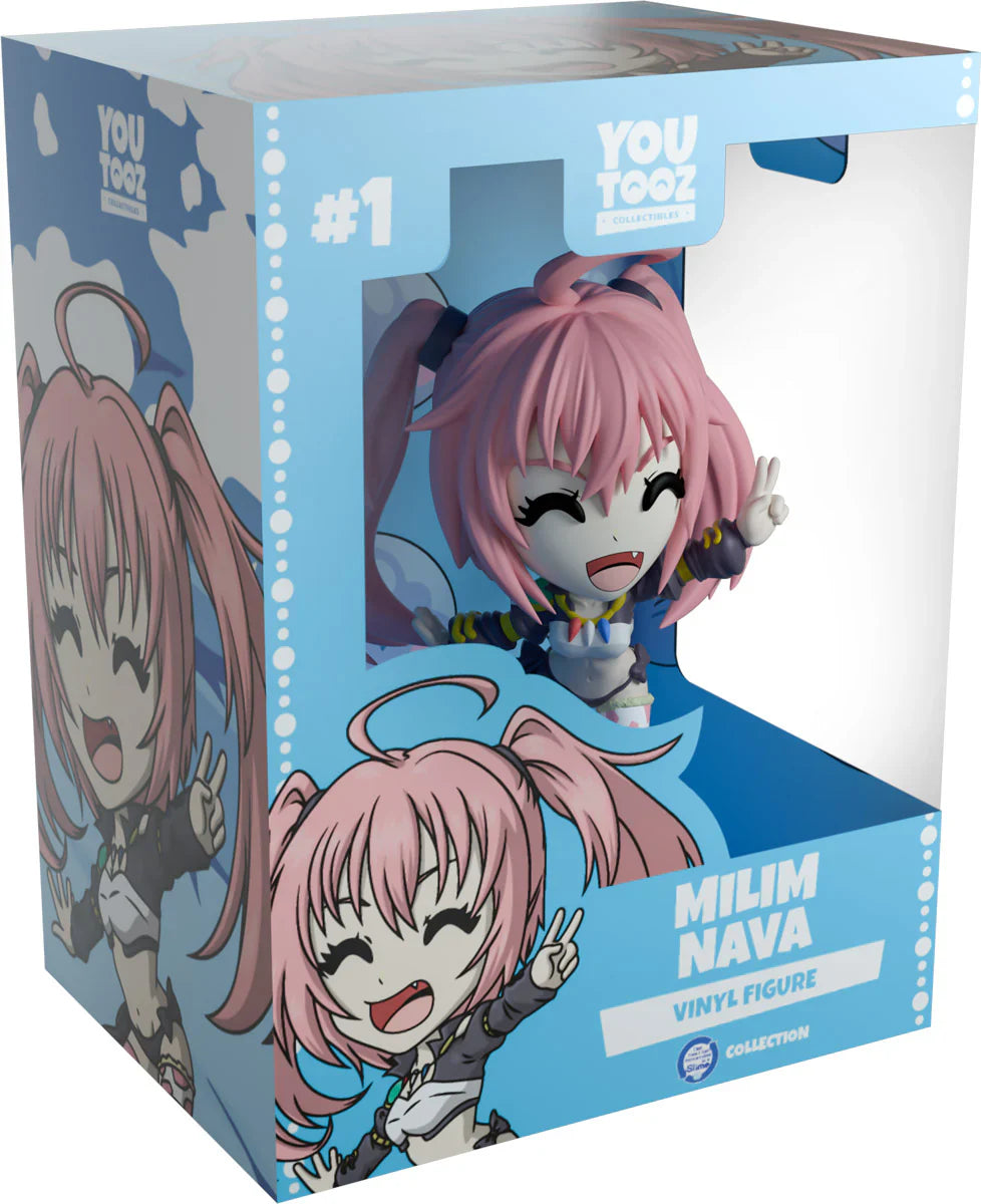Mirim hid her true identity to sneak into Youtooz and make her vinyl debut, and of course have fun along the way! Making a peace sign with her left hand and kneeling over the wiggly Slime that sits at her feet to stand at 4.5 inches tall, a pair of pink ponytails sprout from the back of her headband to wrap around her sides while a large curl of hair curls from the top and bangs fall around her face. With a wide open smile that reveals a sharp, pointed tooth, her black long-sleeved top is accessorized with gold and jewels while her white torso is cut off to show off her bare midriff. Wearing pink and white stockings on one leg and a patterned garter on the other, her outfit is completed with long, segmented red boots. The outside of their packaging shows Milim Nava accompanied by an adorable slime and floating high in the cloudy sky, while the inside is a repeating pattern of blushing slimes on a deep blue gradient. The protective sleeve is then covered in a blue diamond pattern that runs the length of it, as their silhouette can be seen through the large clear window on the front. This collectible comes in a protective, embossed, matte outer sleeve and a custom-sized plastic protector for maximum protection during shipping.