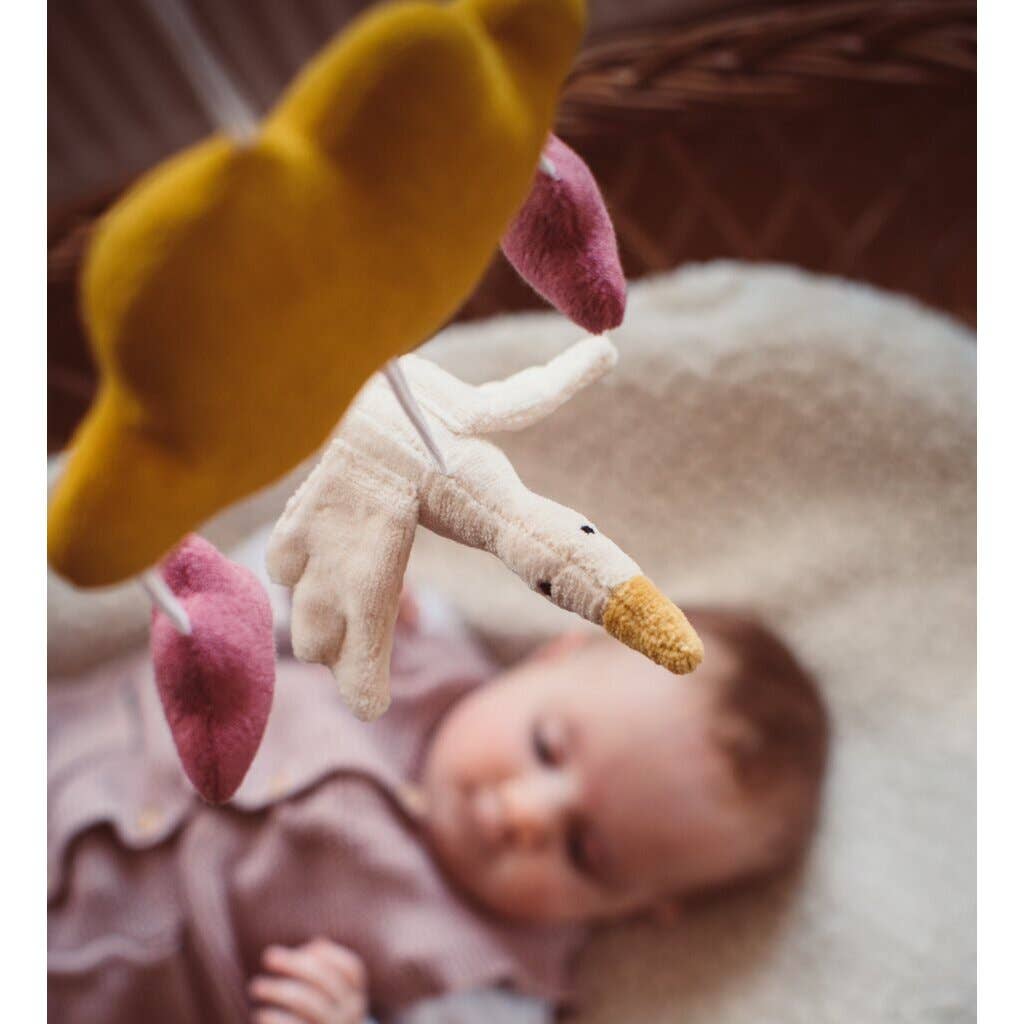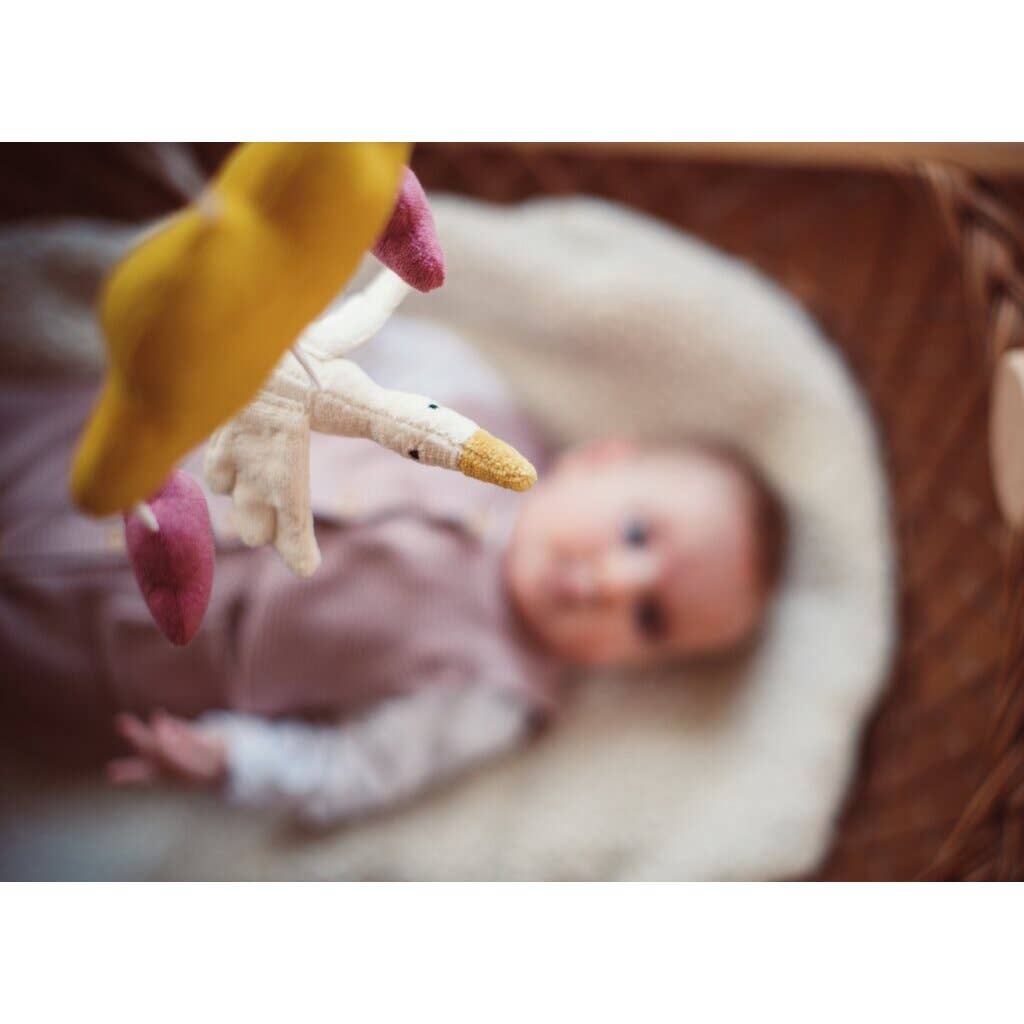 This beautiful pink mobile is a real eye-catcher in any child's room. Thanks to the handy loop on the yellow cloud, it can be easily hung anywhere: from the crib to the stroller, always with you. The little clouds and the goose can also be detached individually and used, for example, on a stroller chain. The mobile's gentle movement helps children calm down and fall asleep more easily.