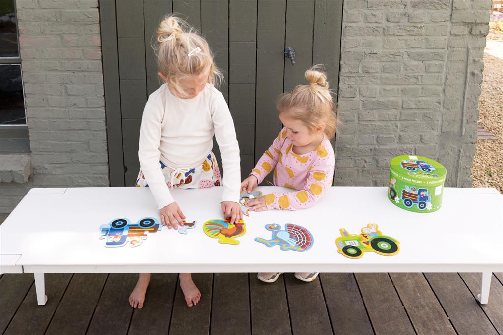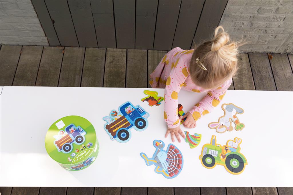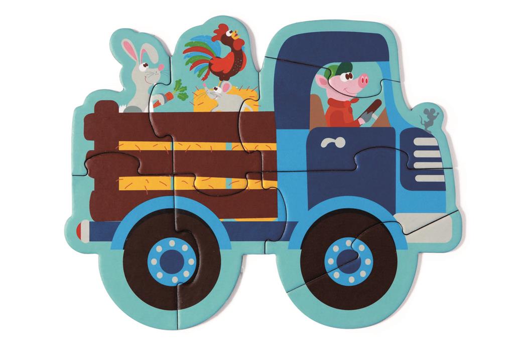 Fun guaranteed with these evolving farm-themed puzzles. 5 beautifully illustrated puzzles for the little ones. Five fun figures to assemble: rabbit (3 pieces), peacock (4 pieces), rooster (5 pieces), tractor (6 pieces) and truck (8 pieces).