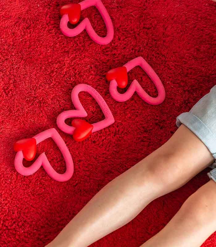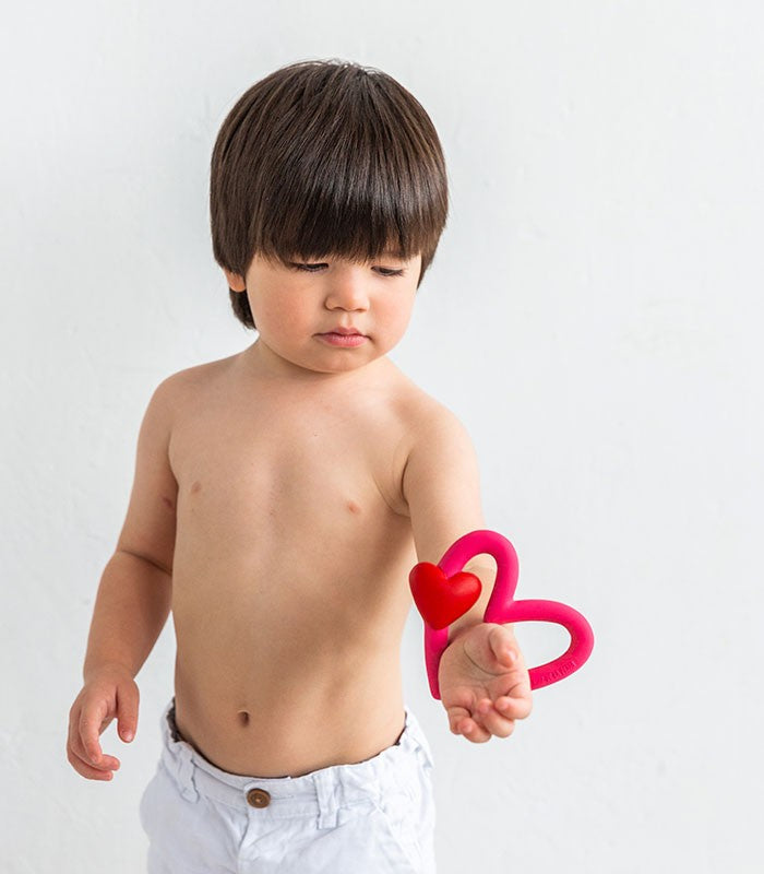 This heart -shaped toy in vibrant colors is a teeth toy, a bath toy, a sensory toy and even a dentition bracelet!