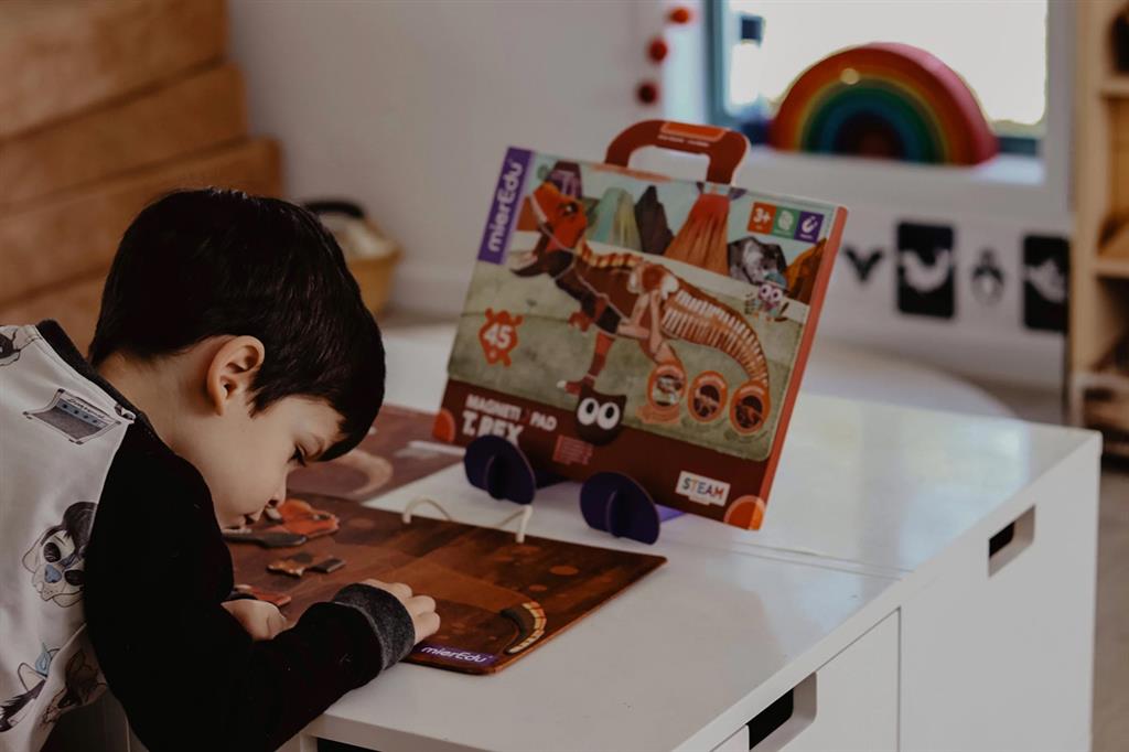 Discover more about the most fascinating creatures to ever walk our planet: dinosaurs. With the Magnetic Pad, you can keep children away from screens while teaching them more about the T-rex, Triceratops, or Stegosaurus. The Magnetic Pad is double-sided. On one side, you recreate the dinosaur with magnetic puzzle pieces, and on the other, you assemble its skeleton. You can stand the Magnetic Pad upright or hang it using the included stand and rope.