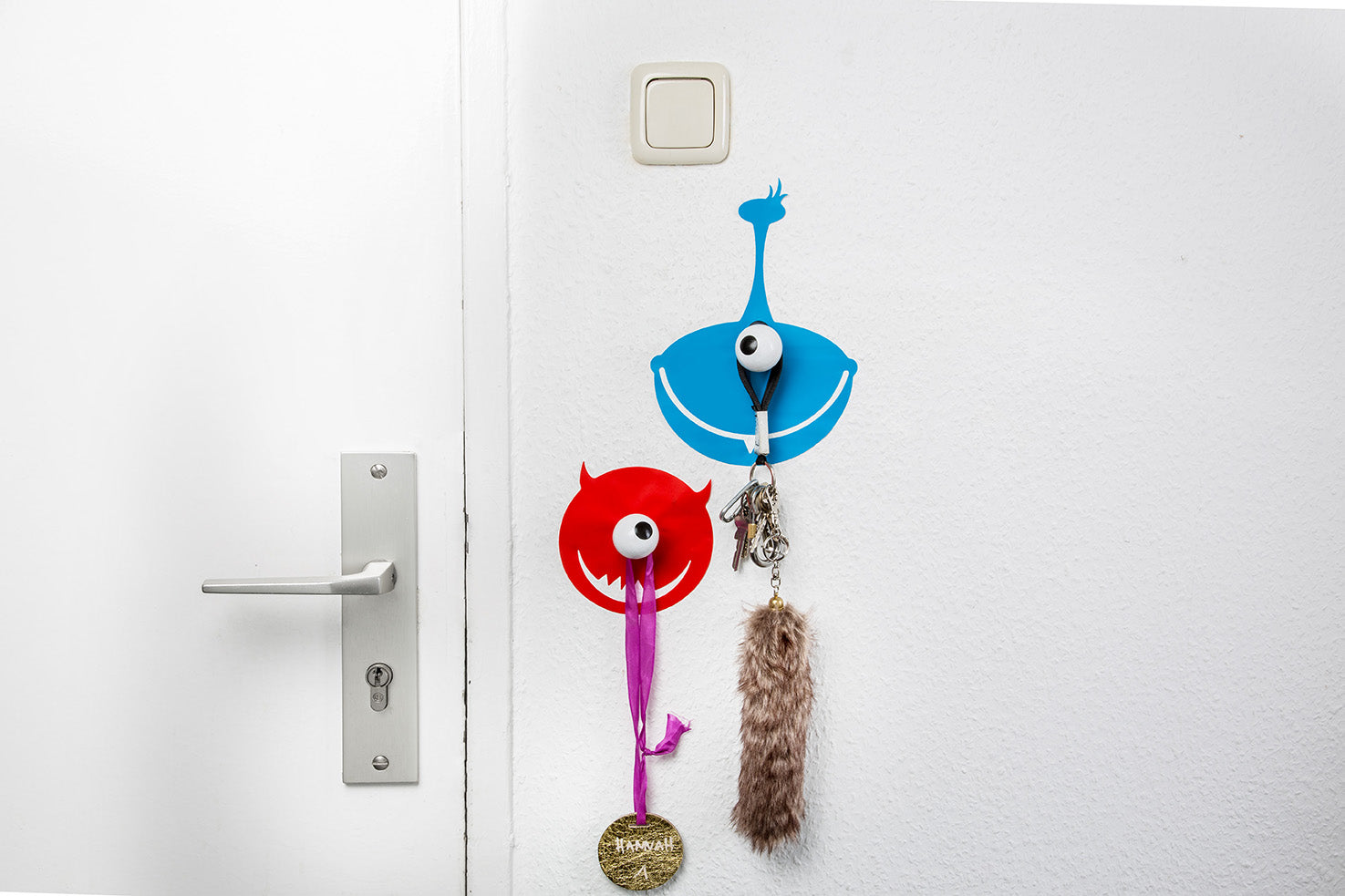 The wardrobe Monsters consists of two wooden eyes used as hooks, screws, ankles and 2 removable wall stickers. Your jackets will be amazed!
