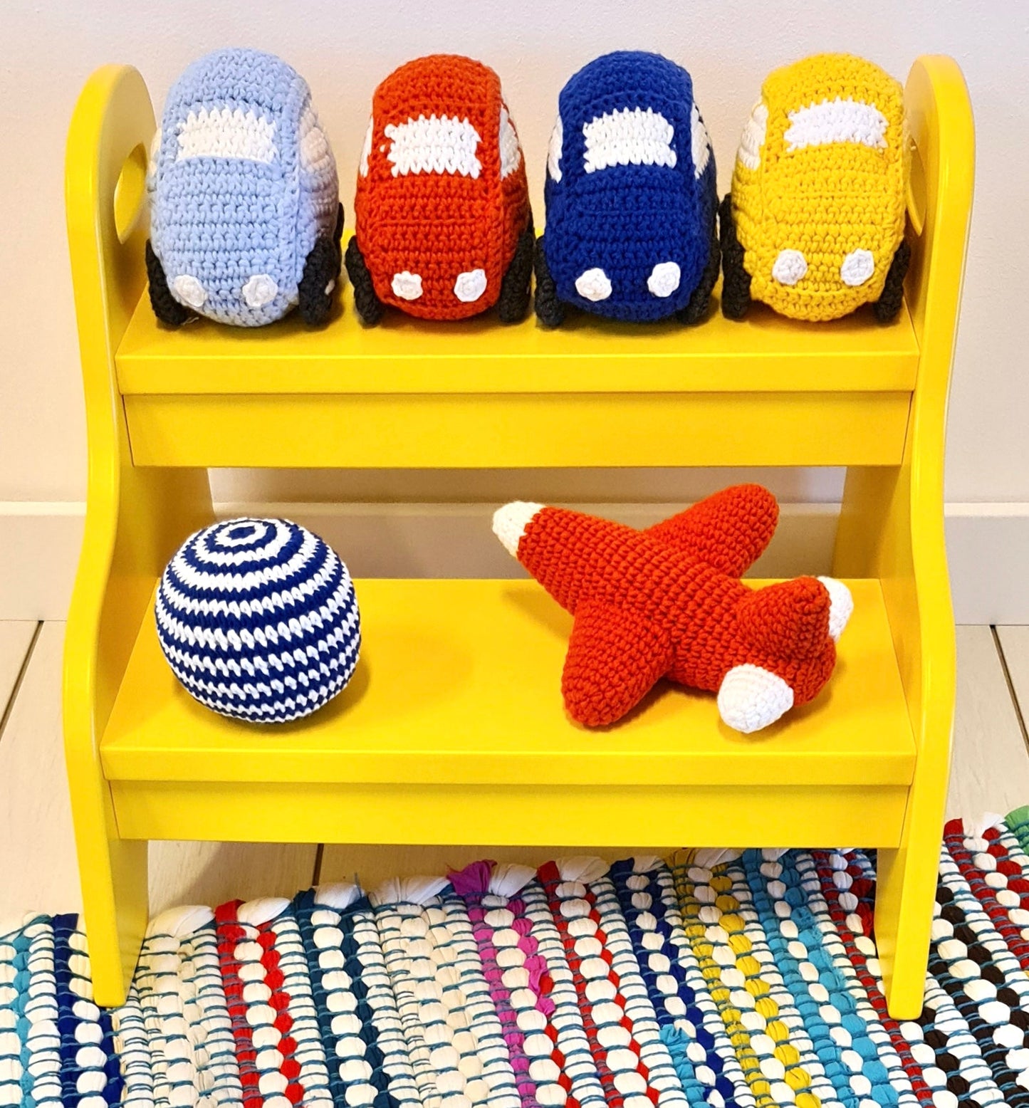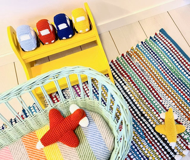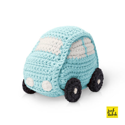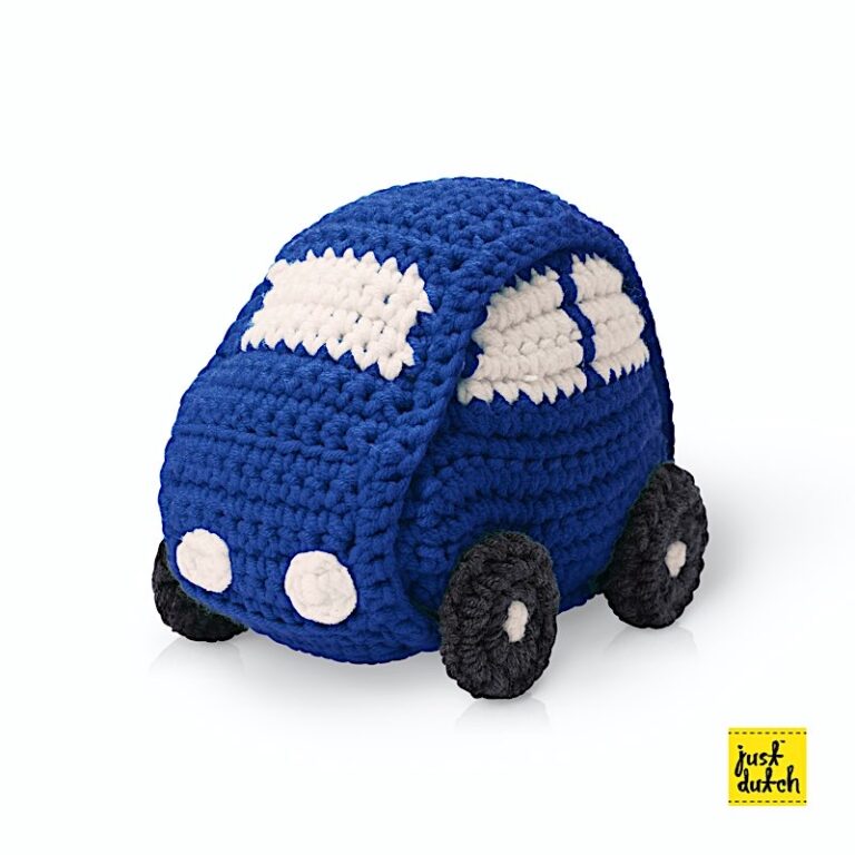 The Just Dutch plush in the shape of a car, handcrafted in Vietnam, as part of an insertion program. Sweet and cute in the cradle.