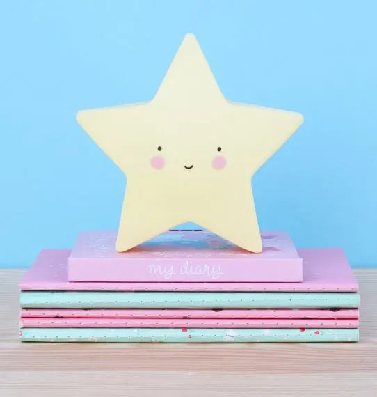 Super cute mini star light available in four colours. These eco-friendly lights are safe for children and made from BPA and lead free PVC; and give off a soft glow when switched on. You can choose to turn the light on, off or timer. When you turn on the timer, the light will automatically turn off after 15 minutes. This saves battery power and is better for the environment! We recommend using this timer, as the batteries provided last approximately 20 hours.