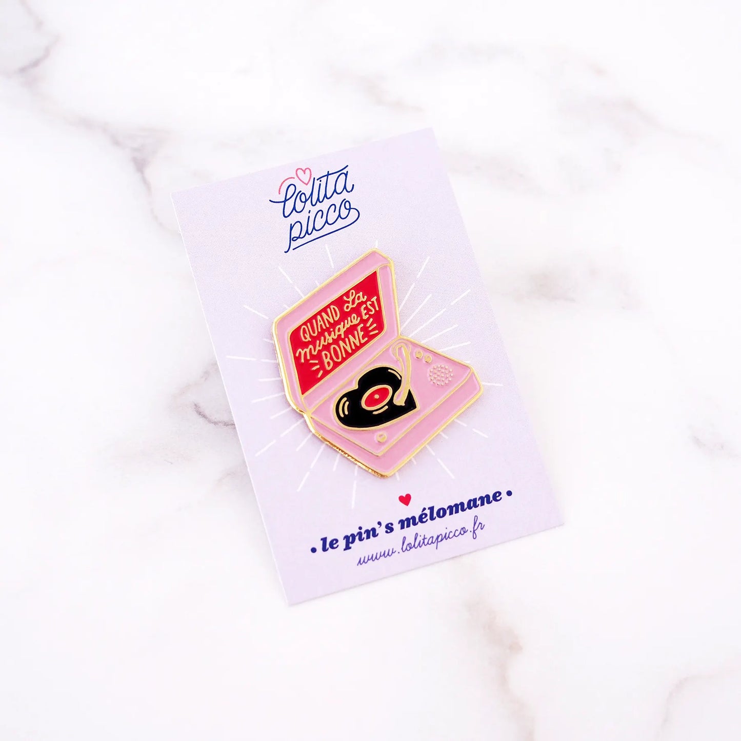 The pop design and adorable heart-shaped vinyl that adorns the When the Music is Good pin will get you surfing on good vibes.