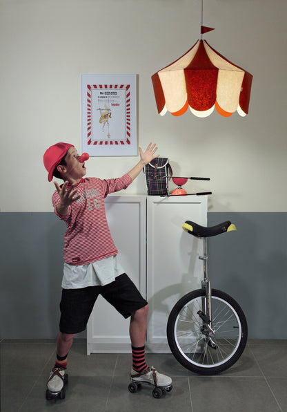 A ceiling lamp in the form of circus. Various colors. Bulb E27 not included. Maximum 100cm cable. LED 14W maximum. This tested.