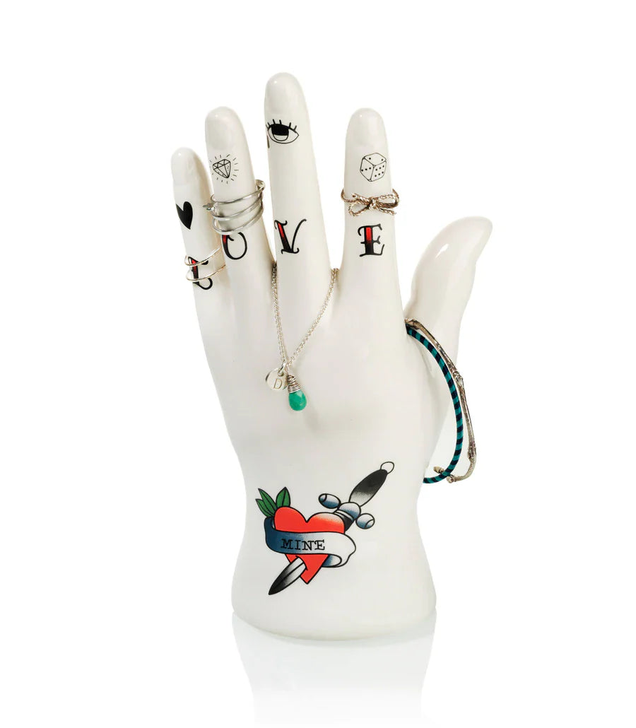 Hang your jewelry with panache on our hand-shaped briefs filled with tattoos. Store your rings on his fingers and drape your necklaces on your hand and remain very rock n 'roll.