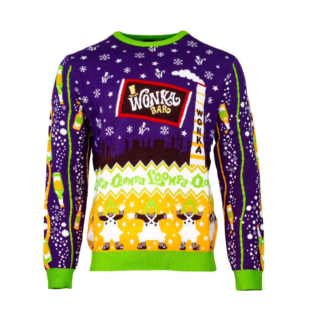 He is sure to say that you really marked the gold ticket for Christmas because you managed to find this incredible festive sweater! Ornated with emblematic colors of purple and orange, this 100 % knitted winter garment is all that a Wonka fan could wish, with the delicious Wonka Bar and a team of dancers Oompa Lompas.
