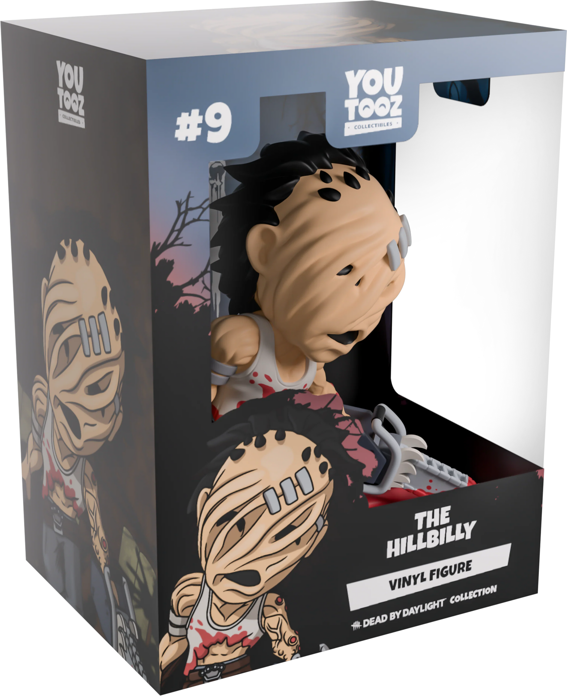 The sound of a chainsaw is not pleasant, especially when followed by the bloodcurdling scream of the Hillbilly! Standing 4.4 inches tall, this killer means business as he strides menacingly forward, his body leaning to the left and dragging a bloodied chainsaw across the ground. In his right hand, he holds a heavy hammer menacingly as his white tank top lies torn and bloodied over gray jeans and black boots. With his mutilated face stretching in grotesque bumps to meet the spiky black hair at the back of his head, thick gray staples on his forehead hold him together. The outside of his packaging sees him hiding in the deep underbrush. While the interior is a black silhouetted forest with a glowing red and blue mist and the white "Dead by Daylight" logo on the back, this sinister design then continues onto the protective sleeve with dark trees completely surrounding it as their silhouette can be seen through the large clear window on the front. This collectible comes in a protective matte, embossed outer sleeve and a custom-sized plastic protector for maximum protection during shipping.