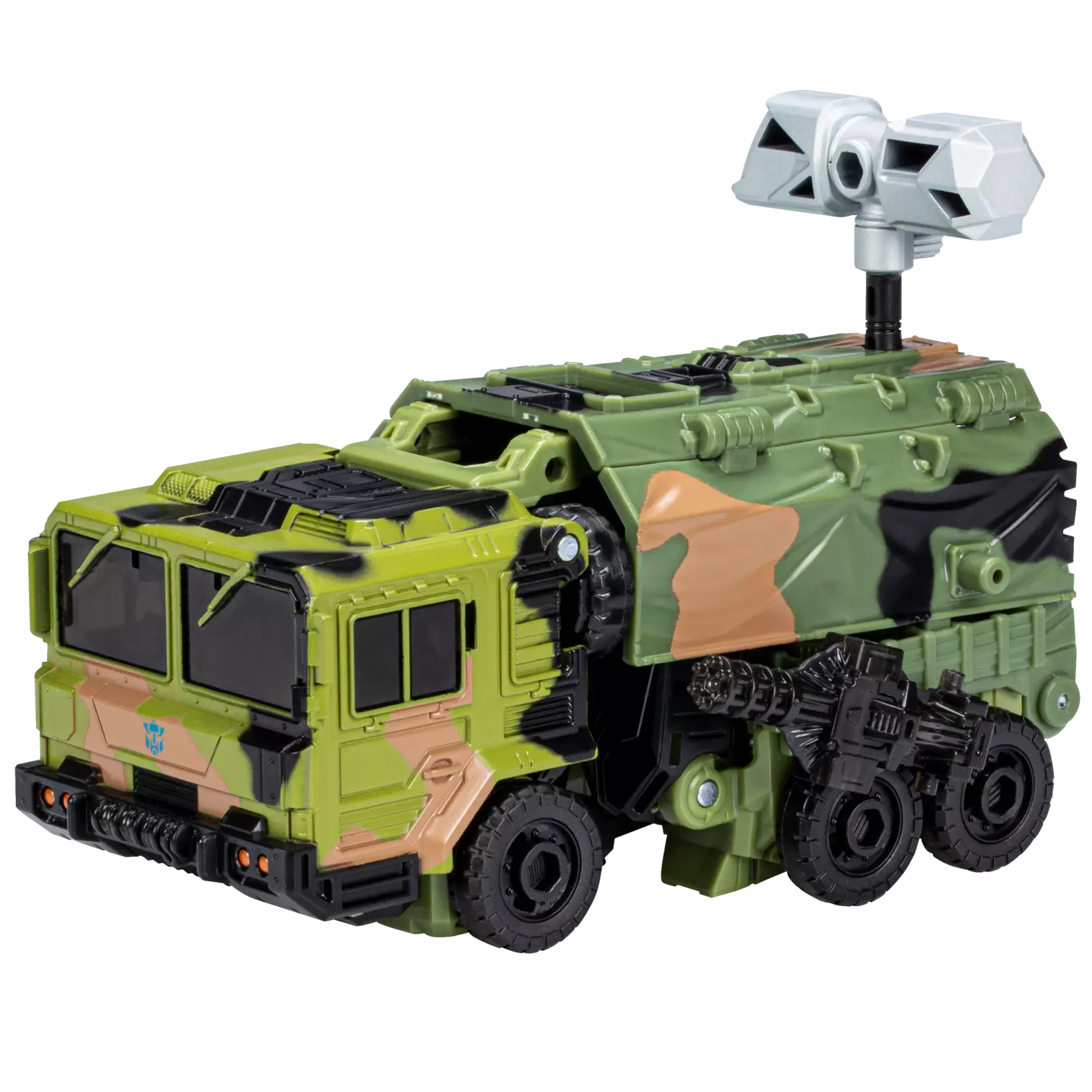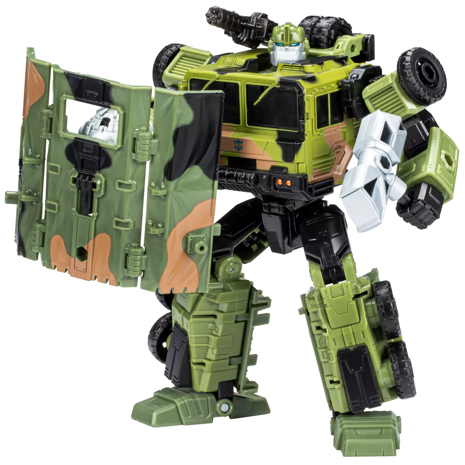 The Prime Universe Bulkhead figure converts into a military van in 31 steps. Includes a mace, hammer, and two blasters that attach in robot and vehicle modes. Remove the back cover of the military van to reveal a shield the figure can carry.