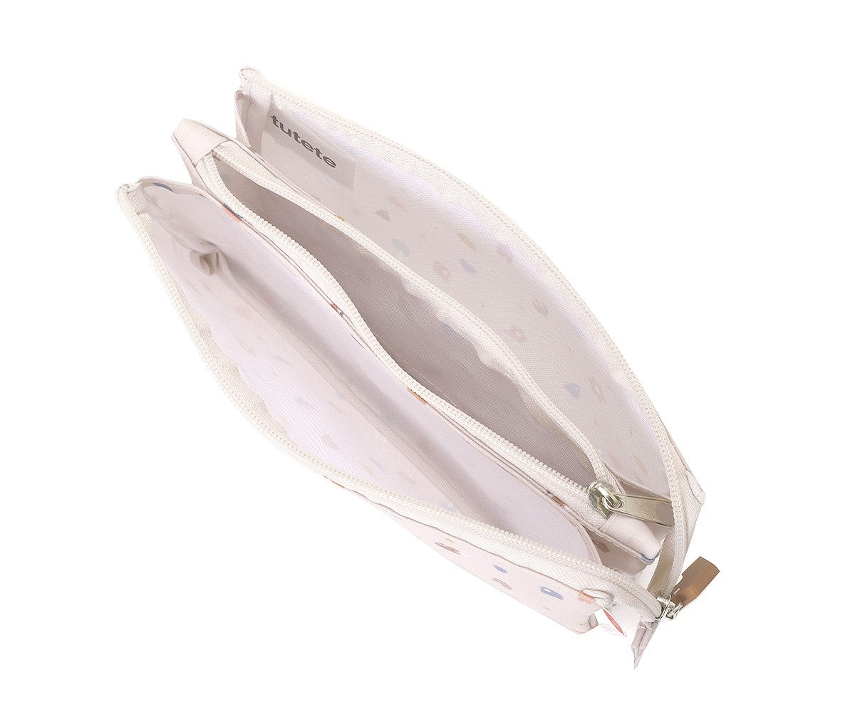 Your child will love storing their school supplies, pencils, markers, crayons, and more in this 3-compartment children's pencil case from Tutete. Featuring an urban print in soft tones and small geometric patterns inspired by nature, it's the perfect accessory for families looking for a modern, neutral, and functional style.