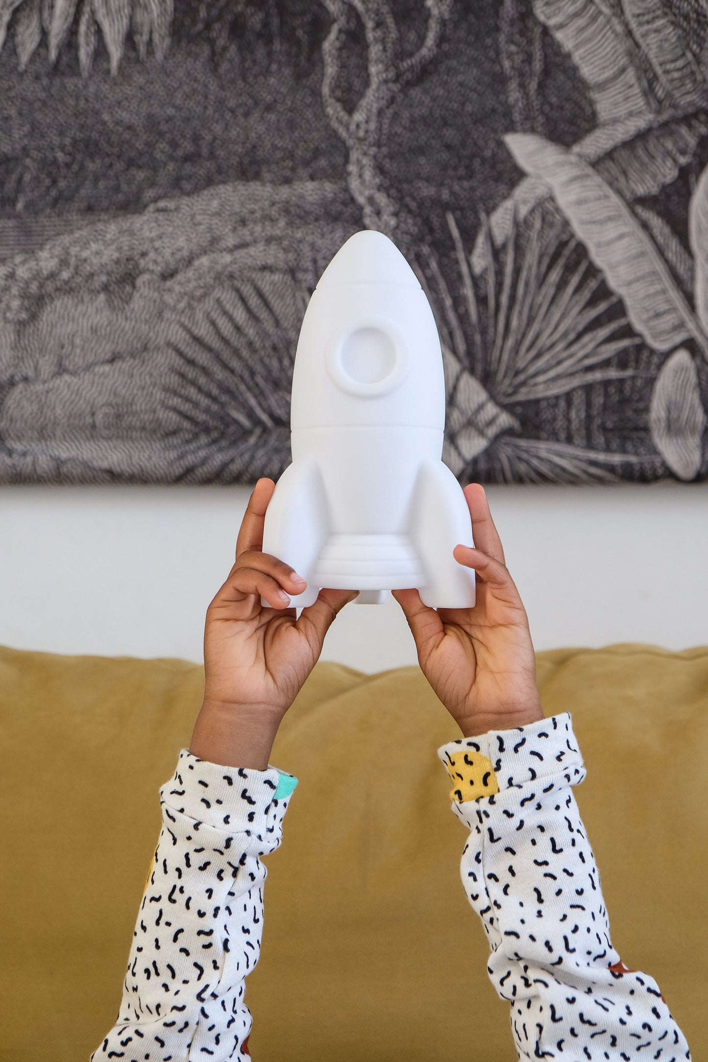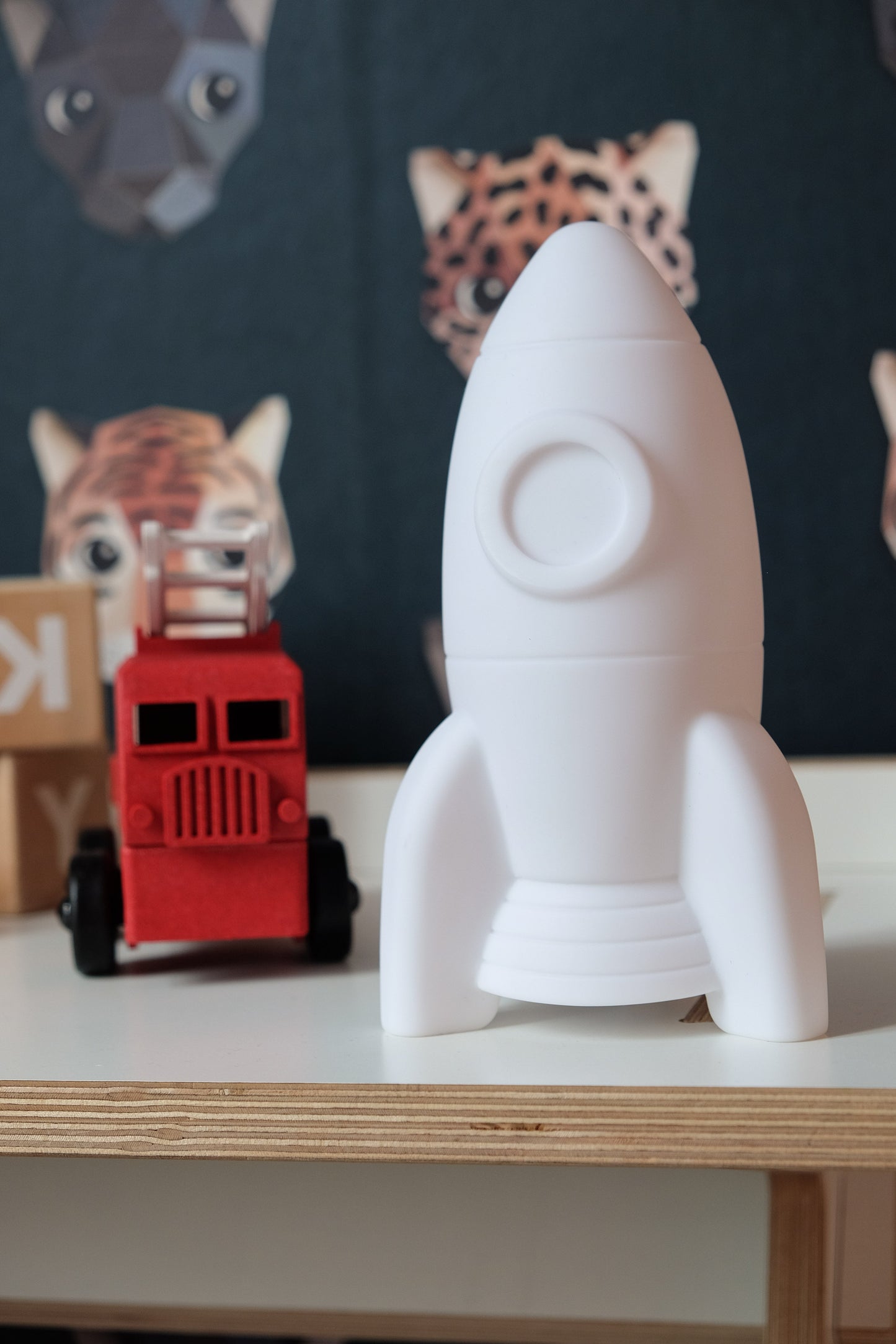 A rechargeable night light in the shape of a rocket. Sweet light allows travel to the moon during your sleep.